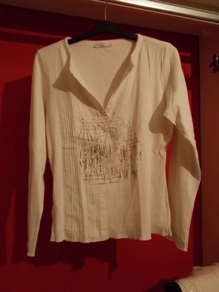 tee-shirt blanc Promod Avec surpiqûres devant et motif, ouverture sans boutons