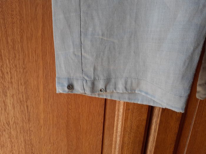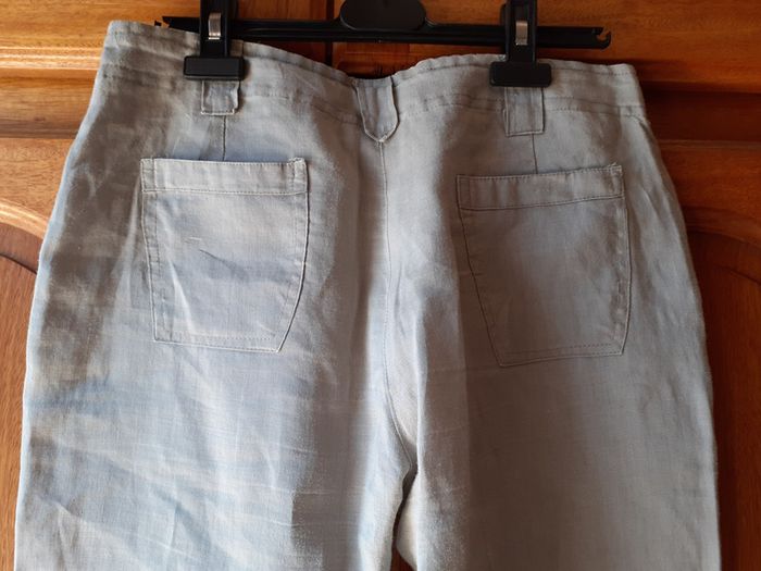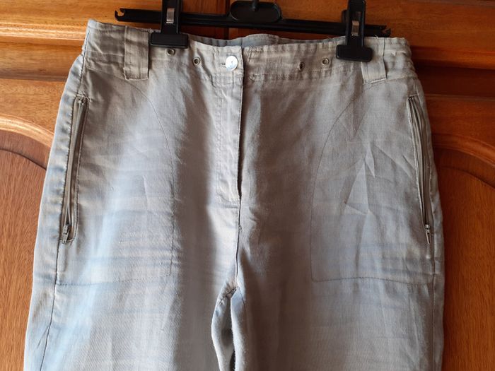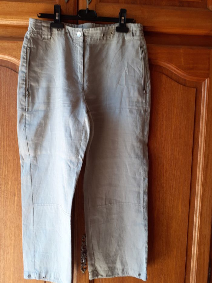 4 poches 100% lin Gris clair Les élastiques de resserrage qui n'étaient pas indispensables ont été retirés Sinon en très bon état Marque Neworld Longueur depuis l'entrejambe 58cm