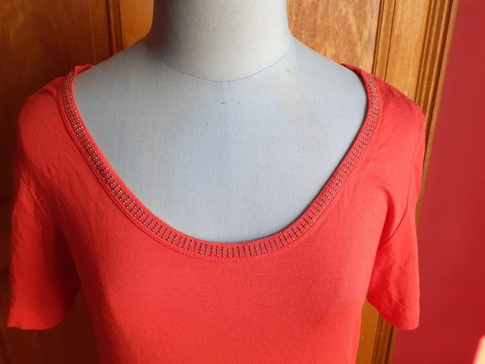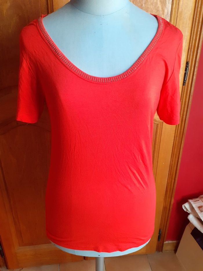1 jacqueline Riu T2 couleur corail Encolure échancrée avec Petits clous fantaisie métal. Il manque 4 petits clous en haut. 1 basique Carla's secret M