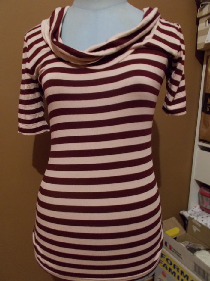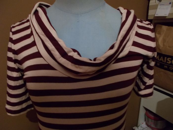 tee-shirt col bénitier rayé beige/marron "bordeaux" manches courtes arrivant presque aux coudes viscose/élasthanne