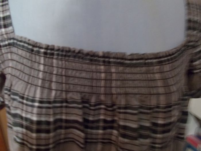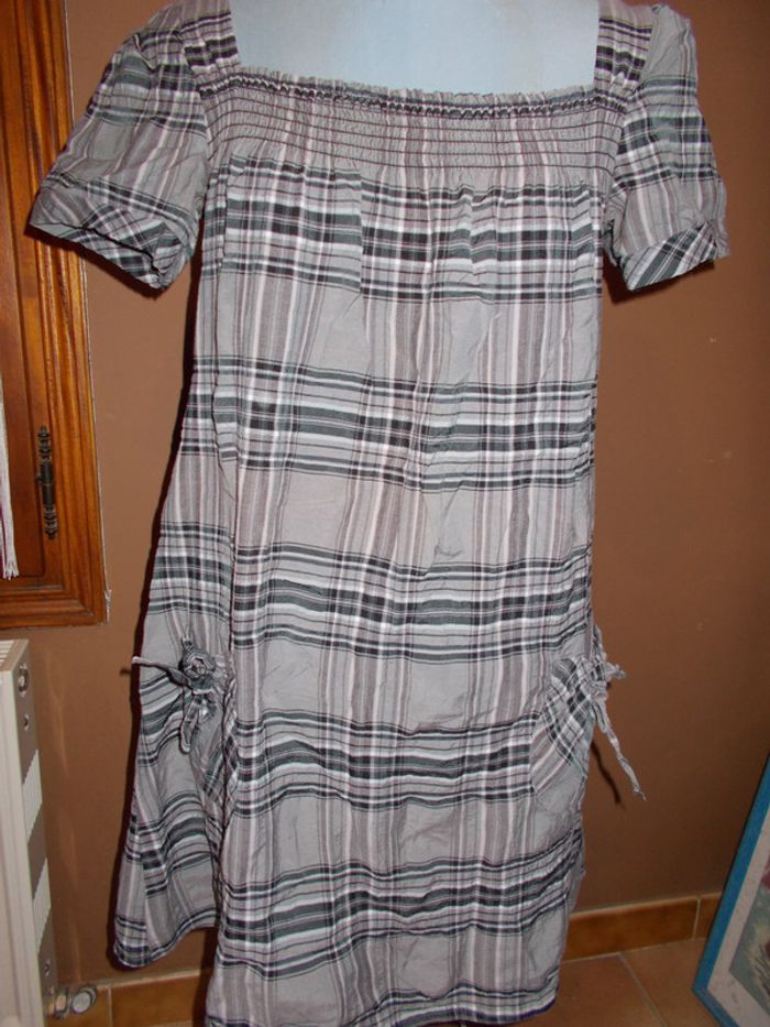 robe coton/polyamide/viscose encolure carrée avec smocks devant 2 poches manches courtes à carreaux gris