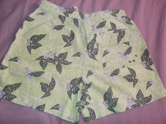 short en toile, vert imprimé feuillage fermeture éclair+scratch poches intérieures sur les côtés.