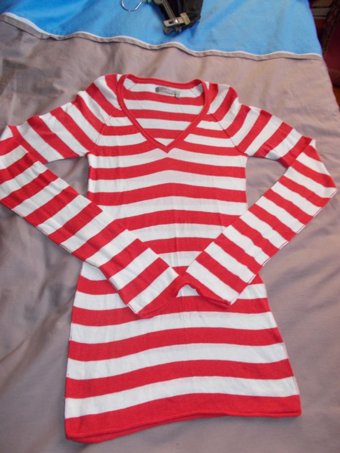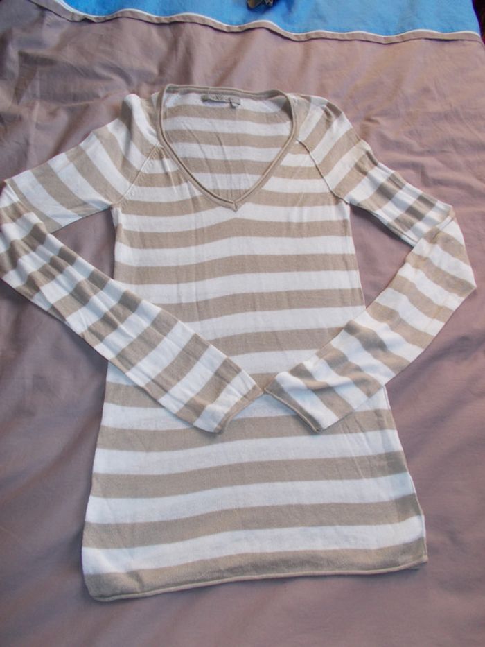 col V. pulls très fins rayés: 1 rouge/blanc et 1 beige/blanc . Coutures apparentes sur l'endroit. 60% coton. très peu portés. A l'unité 2€
