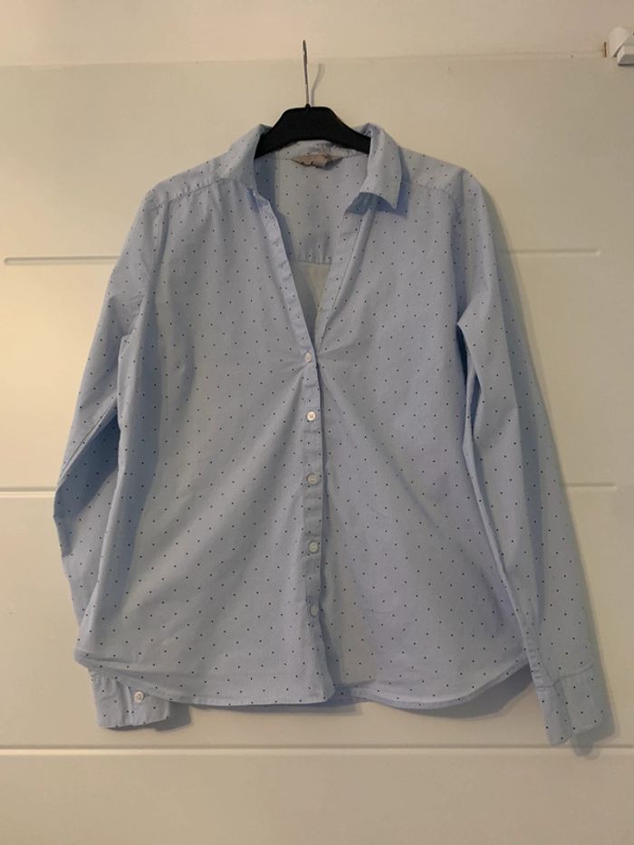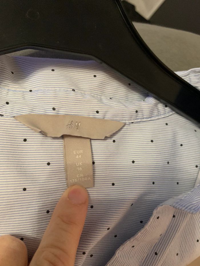 Jolie chemise H&m bleue et blanche , cintrée , portée une seule fois . Taille 44 mais je trouve que ça taille un peu plus petit . Tissu légèrement extensible. 7€