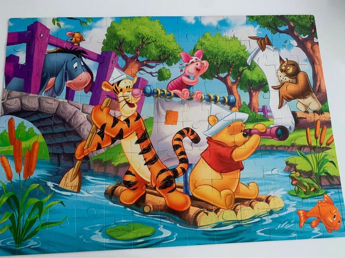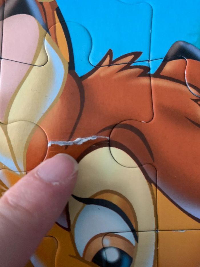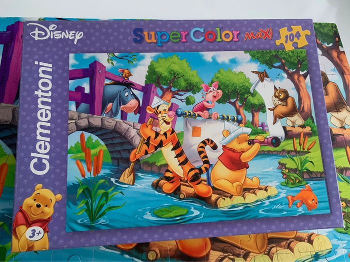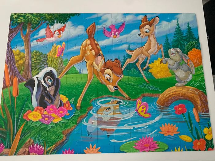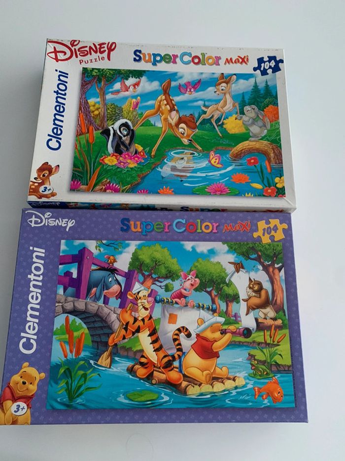 Lot de 2 magnifiques puzzles Clementoni de 104 pièces chacun . N’ont été fait qu’une seule fois mais une pièce de Bambi un peu abîmée ( voir photo ) . Sont bien évidemment complets . 14€ le lot