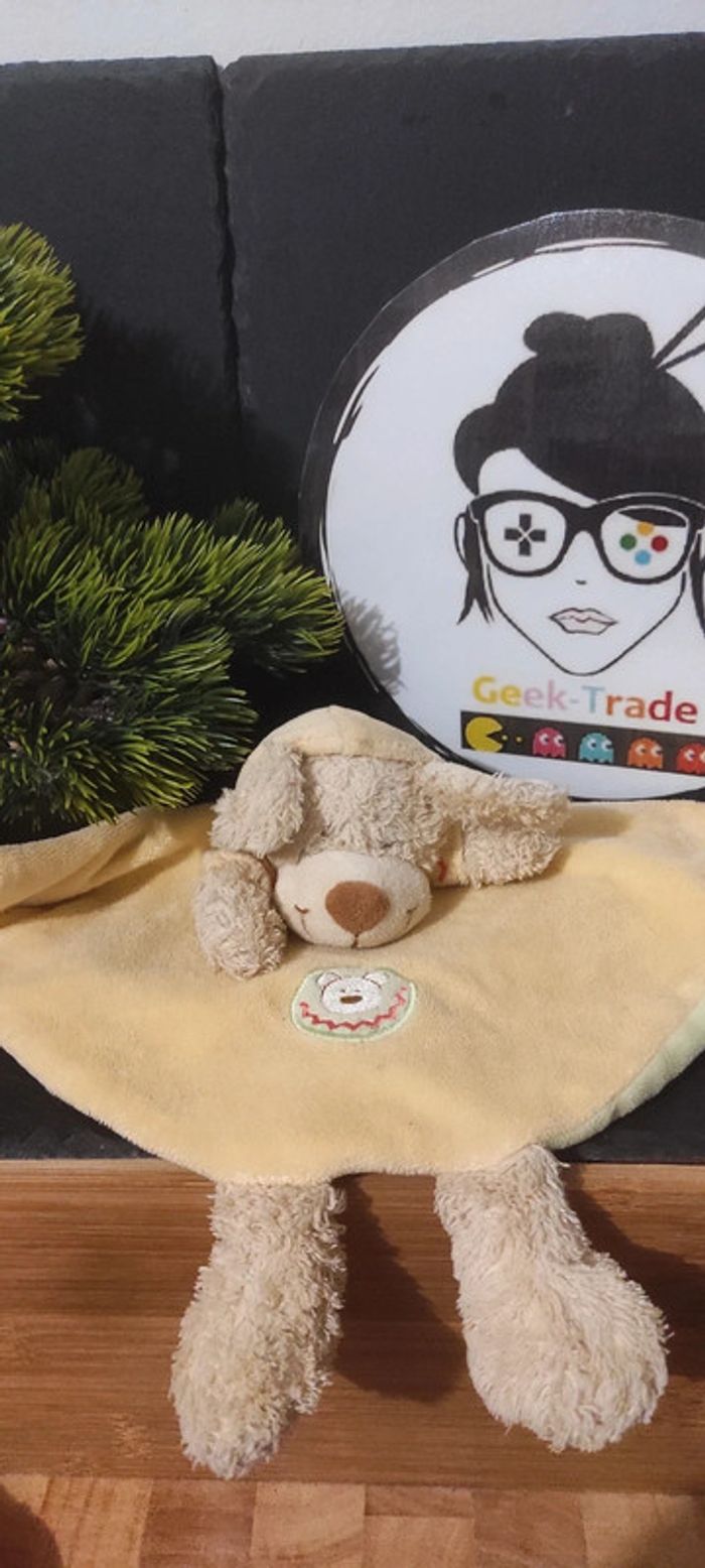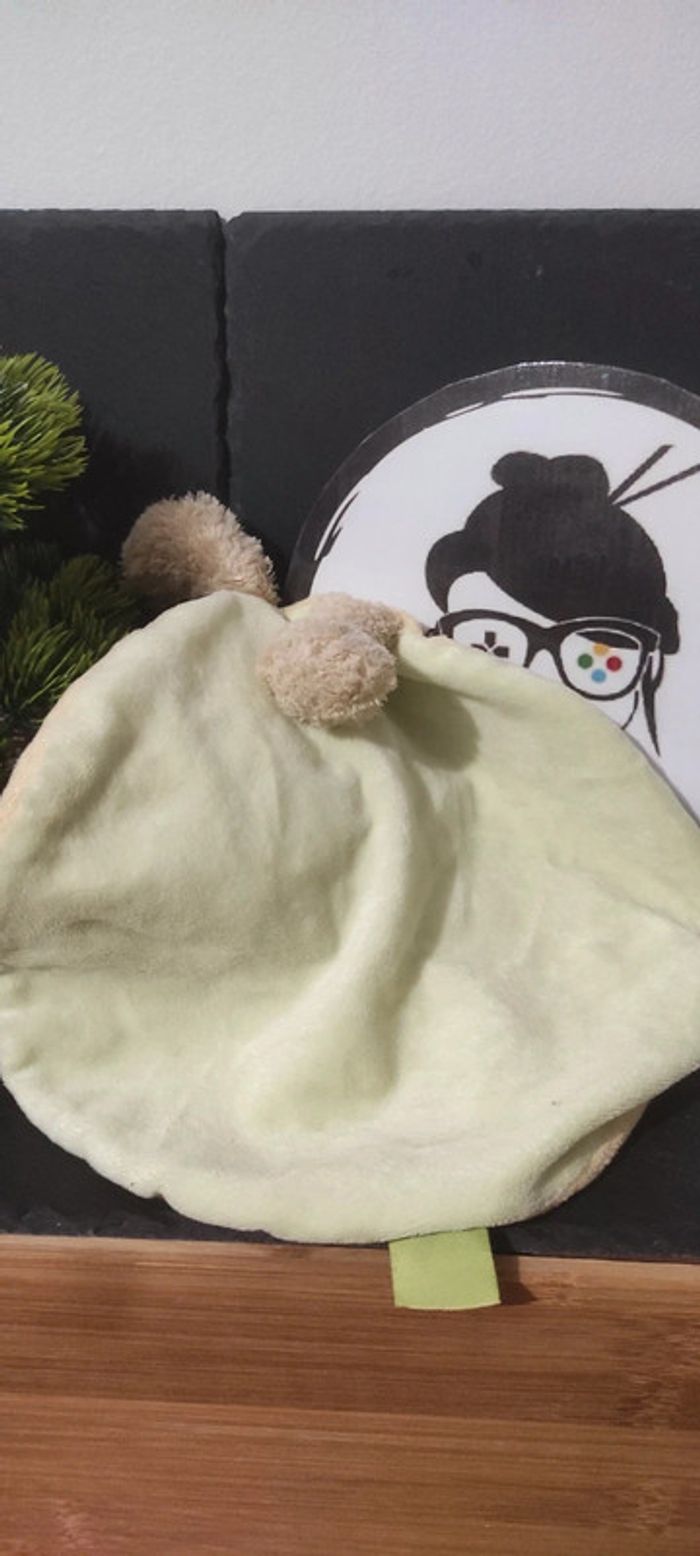 nicotoy Doudou plat rond chien jaune Vert  jambe capuche marron beige Étiquette - photo numéro 1