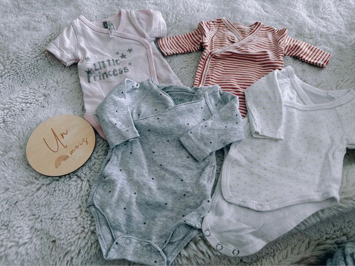 Lot bodies naissance / 1 mois Très bon état Kiabi