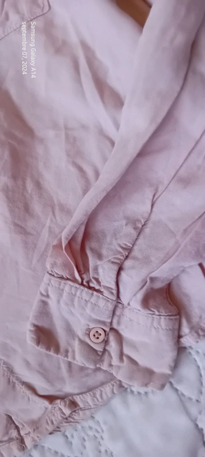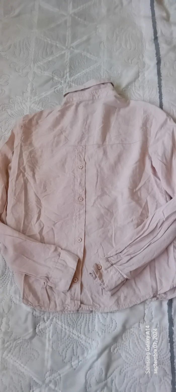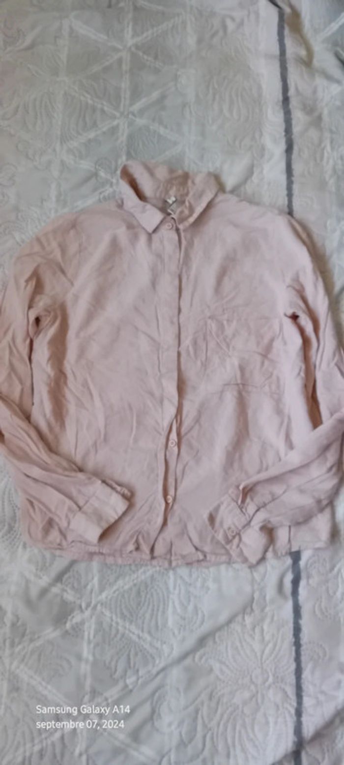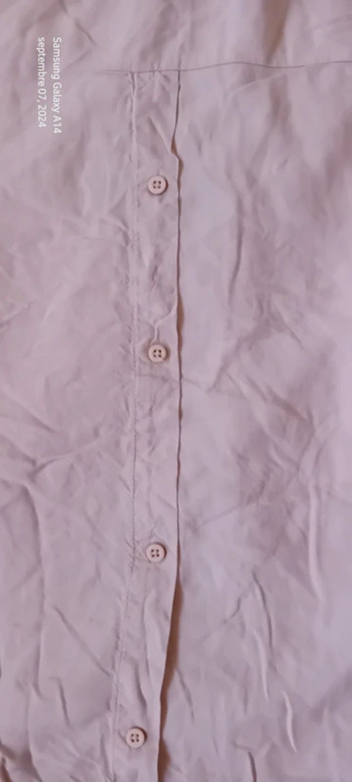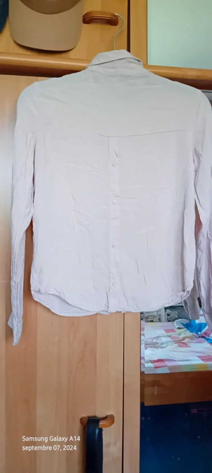 Chemise manches longues en viscose matière légère et fluide poche devant boutons devant et faux boutonnage au dos longueur 53 cm largeur aisselles à aisselles 43 cm largeur épaules 34 cm couleur rose clair très peu porté en très bon état #midole #midolefemme #midolefemmexs #midolefemme #chemise #chemisefemme34 #chemisierfemmexs #bershka