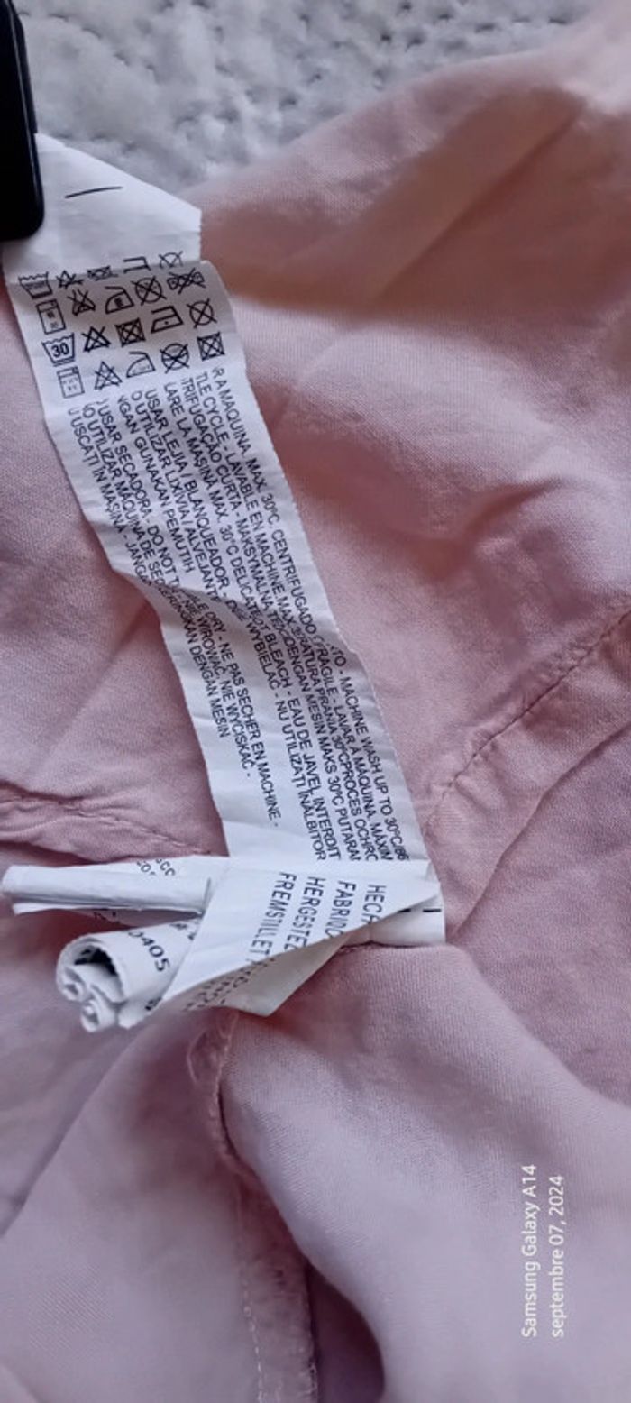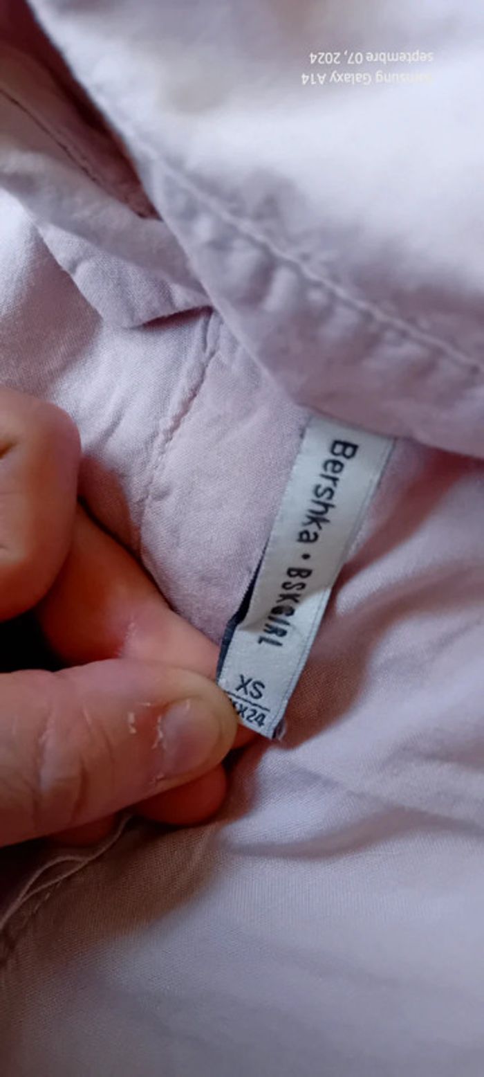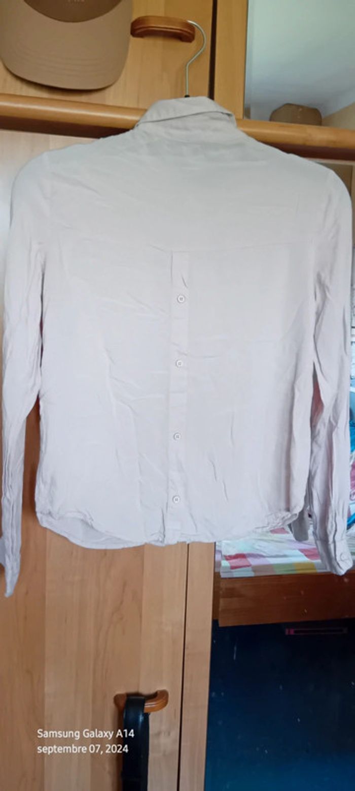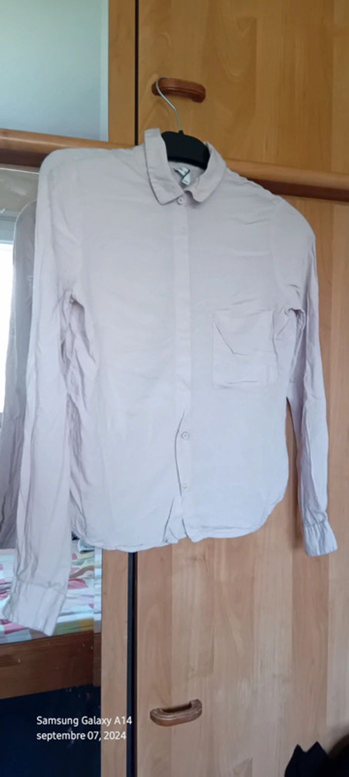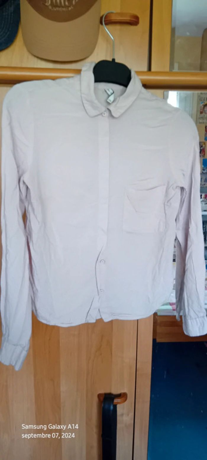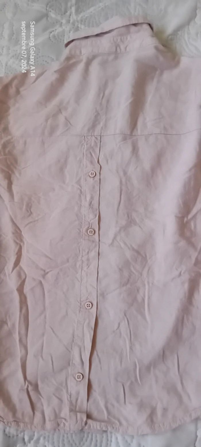 Chemise manches longues en viscose matière légère et fluide poche devant boutons devant et faux boutonnage au dos longueur 53 cm largeur aisselles à aisselles 43 cm largeur épaules 34 cm couleur rose clair très peu porté en très bon état #midole #midolefemme #midolefemmexs #midolefemme #chemise #chemisefemme34 #chemisierfemmexs #bershka