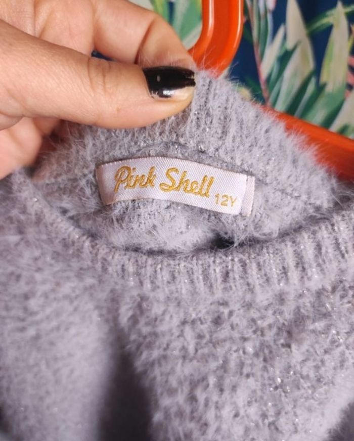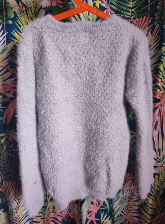 Pull épais qui tient chaud idéal pour le temps froid qui arrive. De taille 12 ans Gris avec des fils argenté