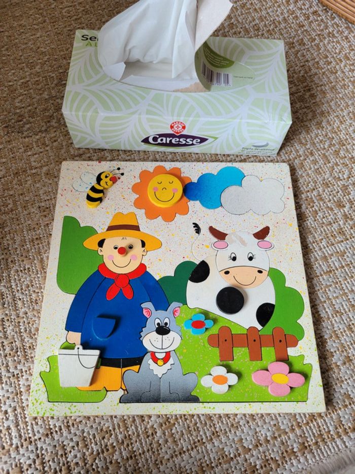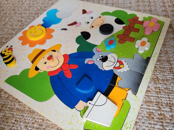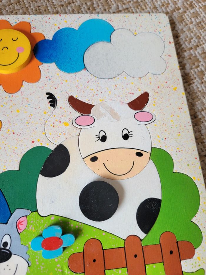 Joli puzzle vintage, en bois La peinture sur la tête de la vache est un peu partie