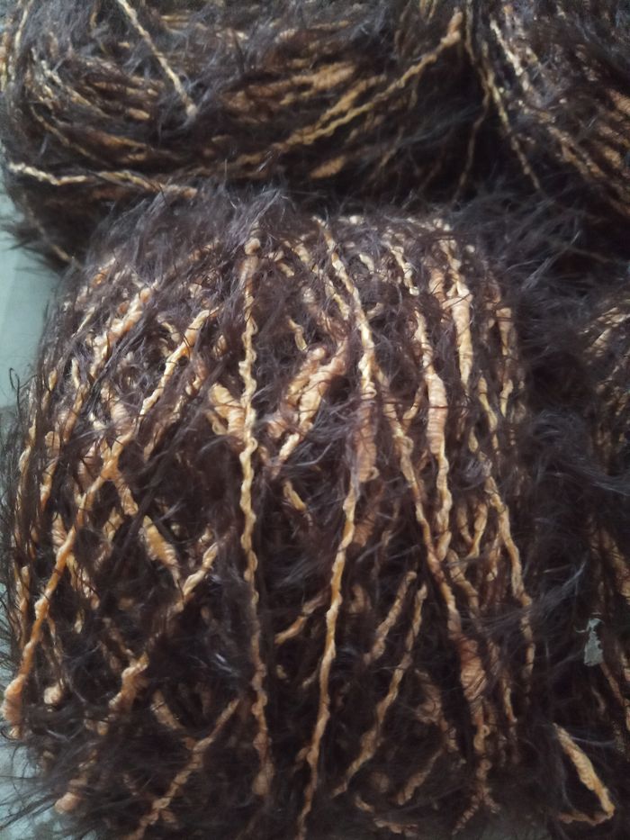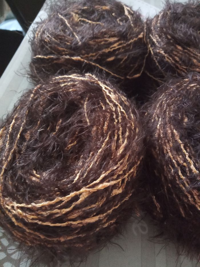 Lot de 4 Pelotes Fantaisies aspect poilu (410g) Couleur: Marron et Jaune orangé 2 fils fantaisies au total 410g Lot en parfait état