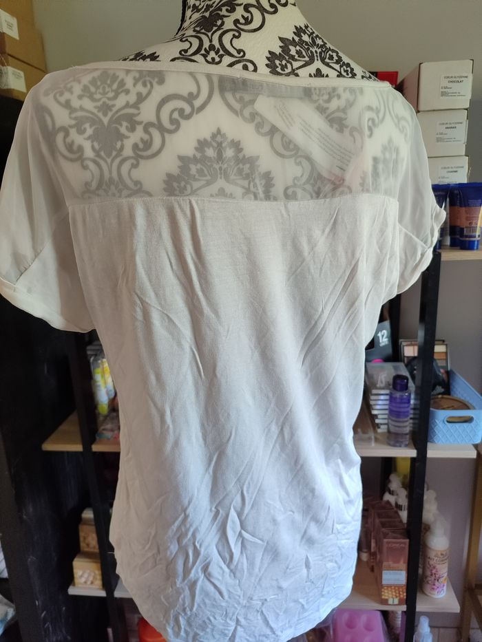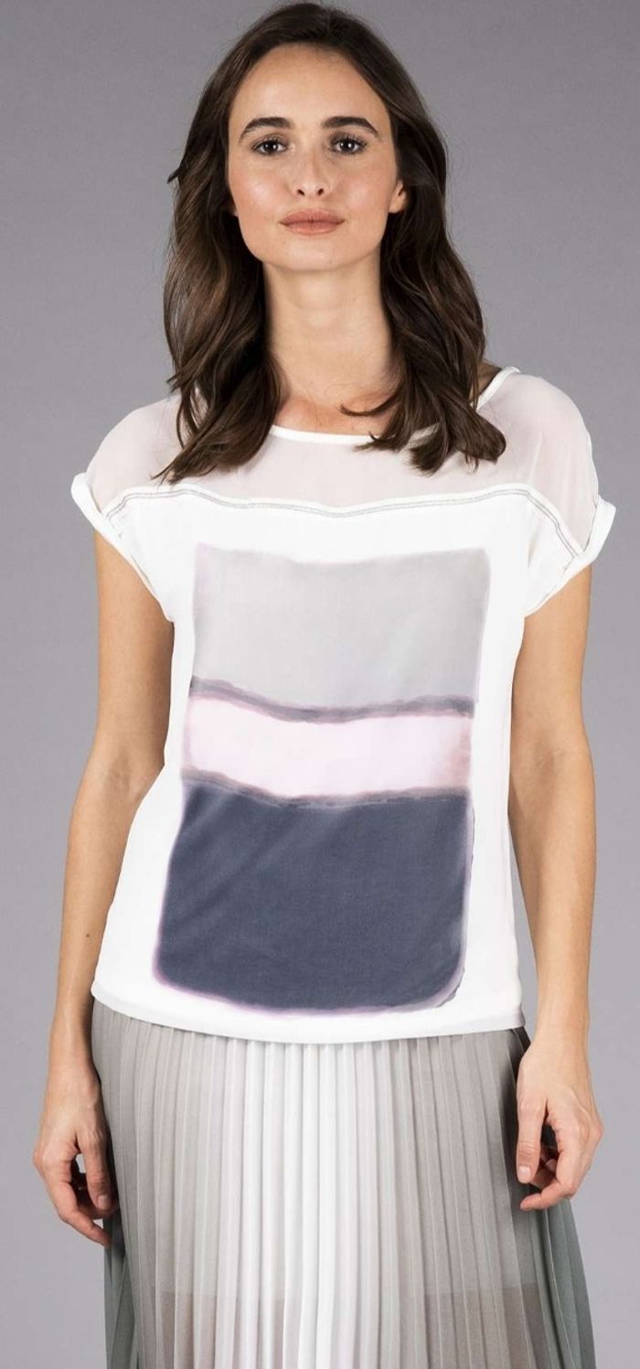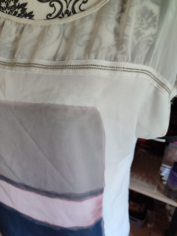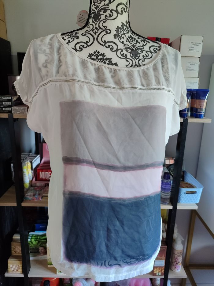 Top imprimé galon fantaisie - Captain tortue - T1 Détails : • T-Shirt au décolleté transparent • Décolleté souligné d’une chainette bijoux • Motif inspiré des peintres abstraits aux couleurs de la collection. Matières et coupe : • Matière principale : 96% viscose, 4% élasthanne • Voile : 100% polyester • Coupe droite T1 = 38-40 #femmesrose64121