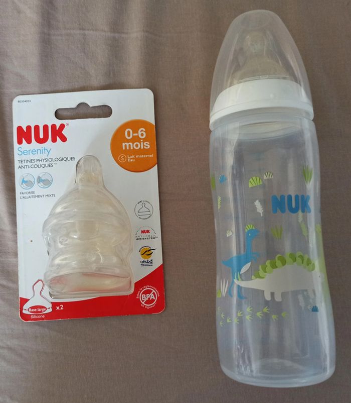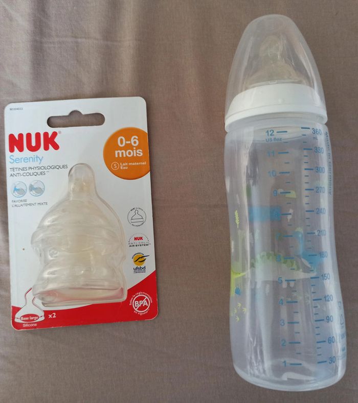 Biberon nuk 360ml en très bon état car peu utilisé avec 1 tétine 0-6mois S + 1 pack non ouvert deux tétines 0-6 mois lait maternel et eau marque nuk.