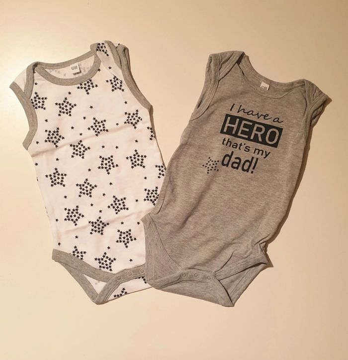 6 mois 1 body gris avec des écriture noir et 1 blanc avec des etoiles