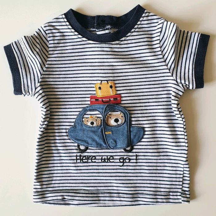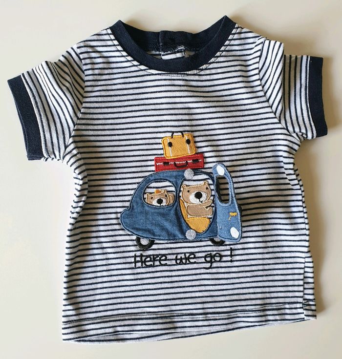 3 mois T-shirt manche courte rayer bleu et blanc avec une voiture et la petite porte de la voiture s'ouvre.