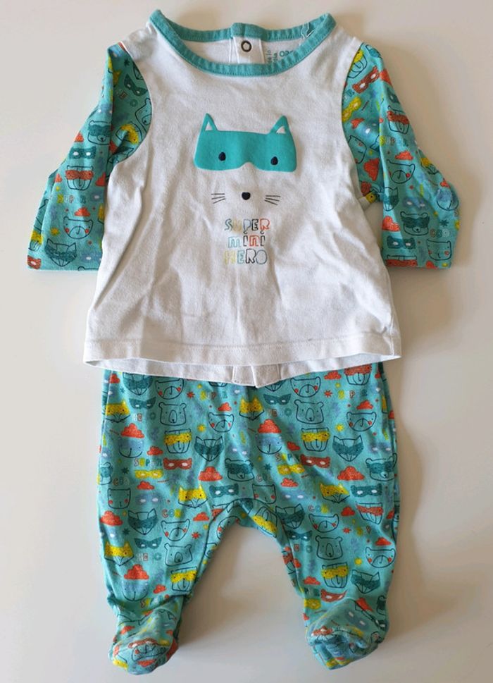 3 mois Ensemble renard haud blanc "super mini hero" avec manche longue motif Bas bleu-vert avec motif