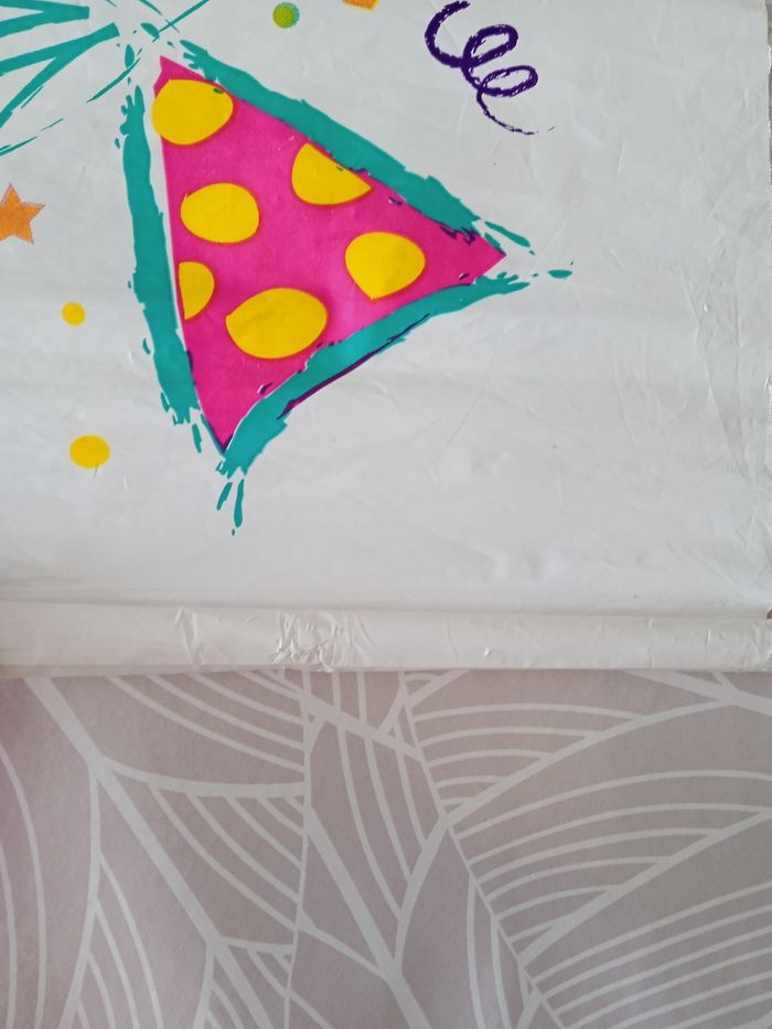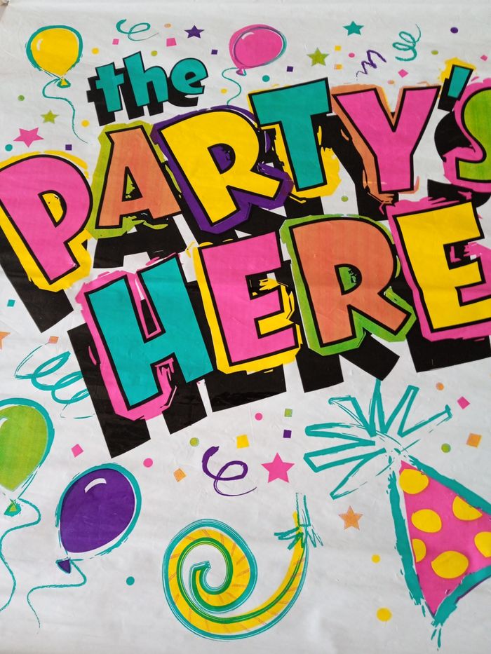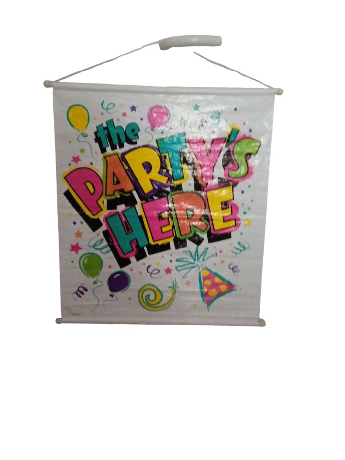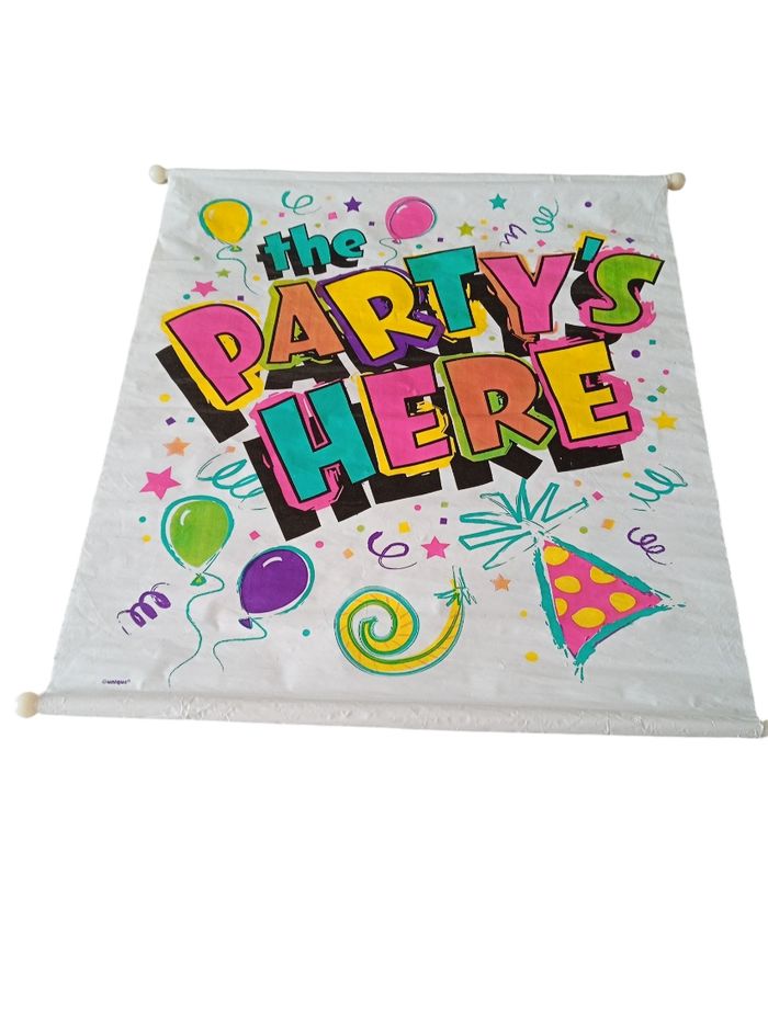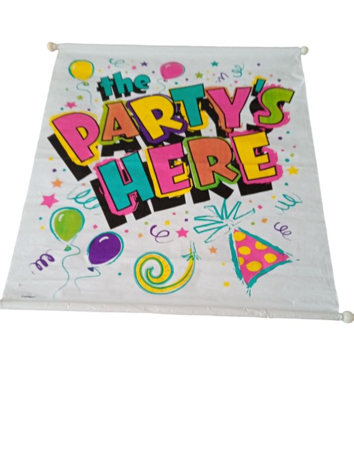 Affiche anniversaire "the party s here". Dimension 50 cm sur 45,5. Accrochage avec une petite corde. Petit trou sur un côté très léger voir photos. L affiche est recto verso. #accessoiremaisonnade3033 #bazarnade3033 #décorationnade3033