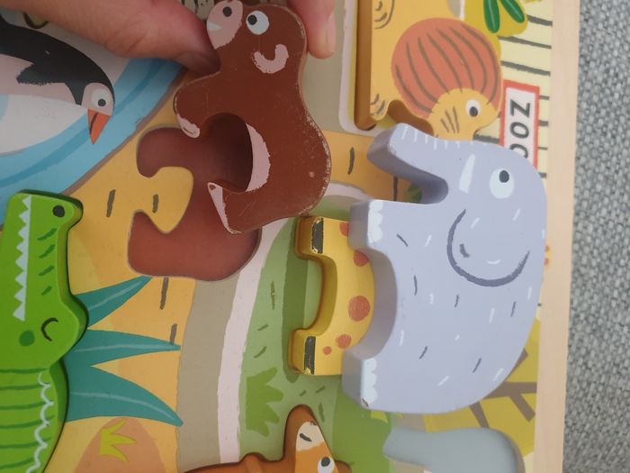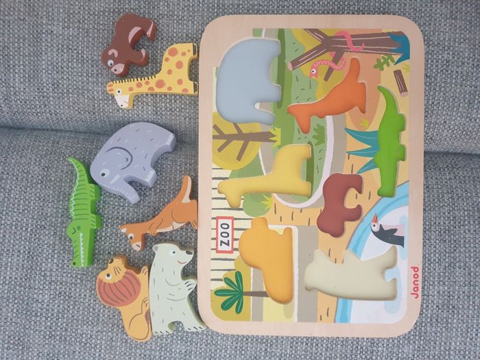 Puzzle animaux en bois pour les enfants de 1er âge. Il est en trés bon état, il y a de légers défauts d'usure trés peu visibles. Voir les photos.