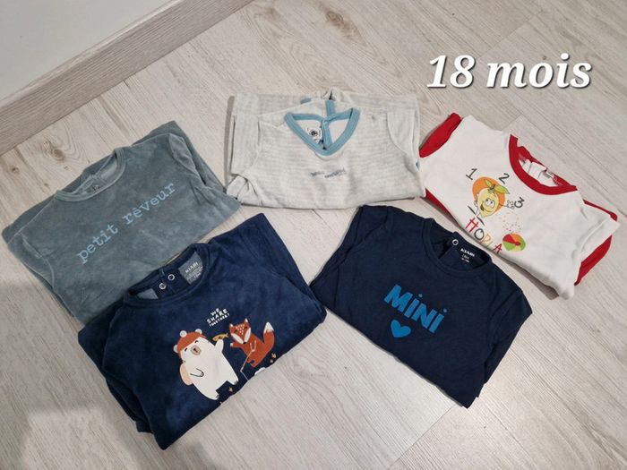 Lot de 5 pyjama une pièce. De pyjama Kiabi velours, 2 légers et un marque Petit bateau éponge. 2 € le pyjama ou 9 € le lot.