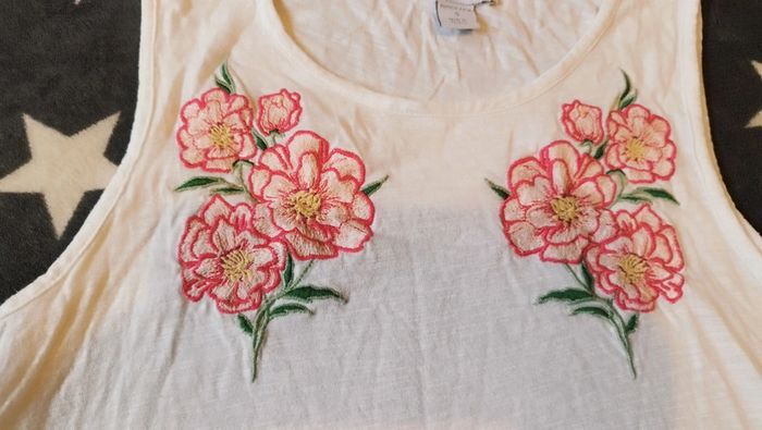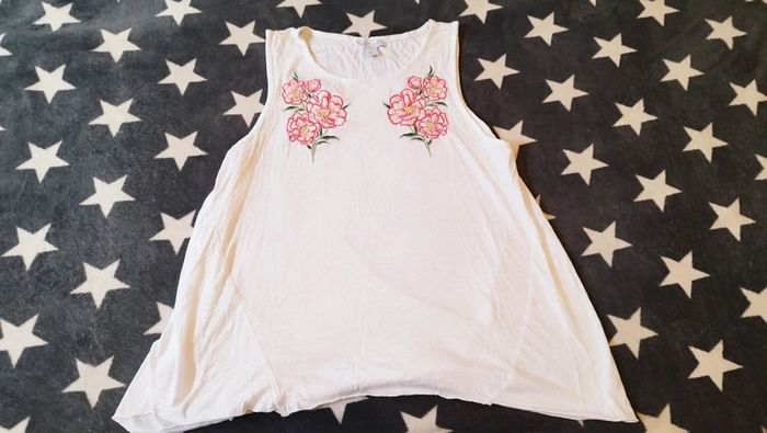 Joli petit débardeur blanc, lâche, tout simple, avec roses brodés. Très bon état général D'autres articles en S par ici : #femme36elpi2201