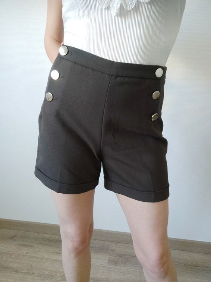 Joli short taille haute style officier avec trois rangées de boutons dorées de chaque côté. Polyester, viscose et elastane, il est très agréable à porter pour toutes les saisons, avec ou sans collants. Excellent état car très peu porté. D'autres articles en 34 par ici : #femme34elpi2201 #shorthetm #shorttaillehaute #shortofficier #kaki #shortkaki