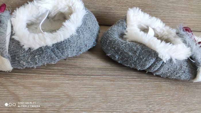 Adorables petits chaussons tout doux, façon renard avec petits noeuds bordeaux. Tout doux, ils ont été portés donc quelques bouloches (cf photo) mais restent en très bon état général. Lavés avec lessive désinfectante pour la vente. Étiquetés en 20, ils peuvent être portés un peu plus longtemps (ma fille les a gardés jusqu'au 22). D'autres chaussons ou chaussures par ici : #chaussuresfilleelpi2201 Et des vêtements par ici : #fille18moiselpi2201