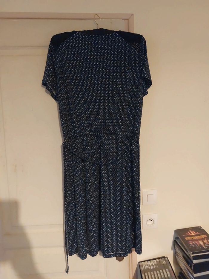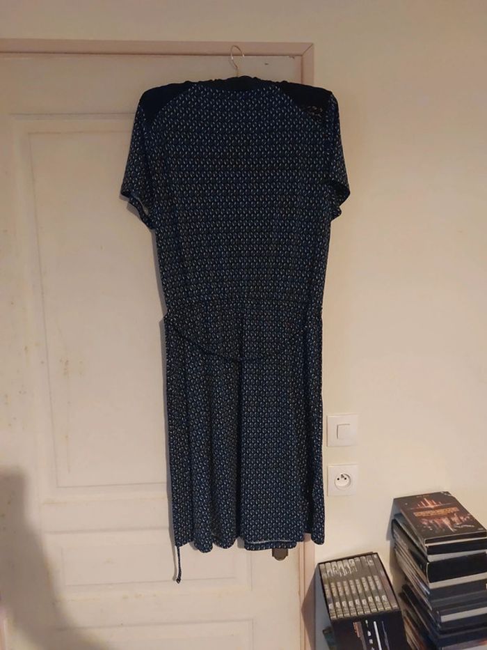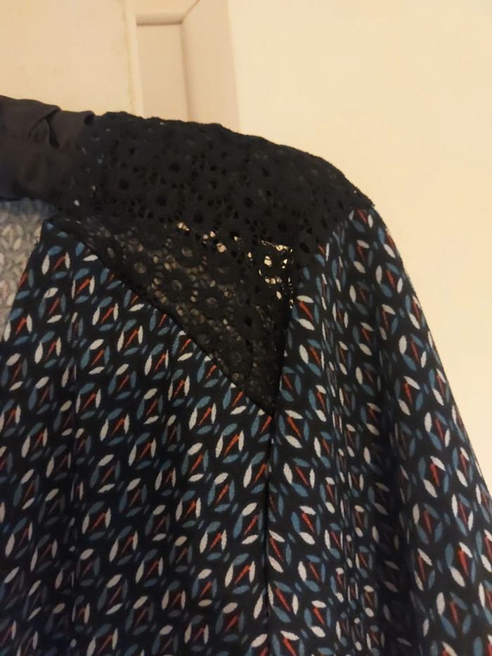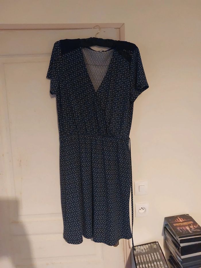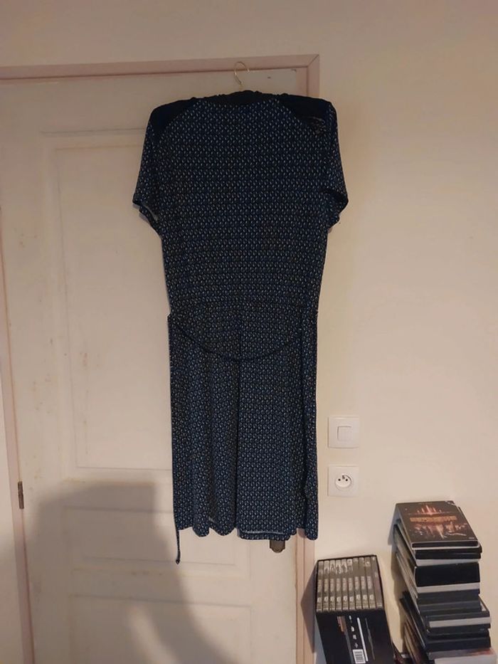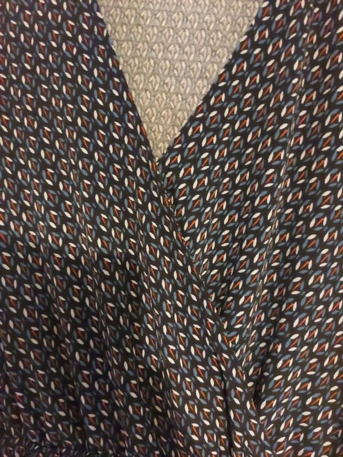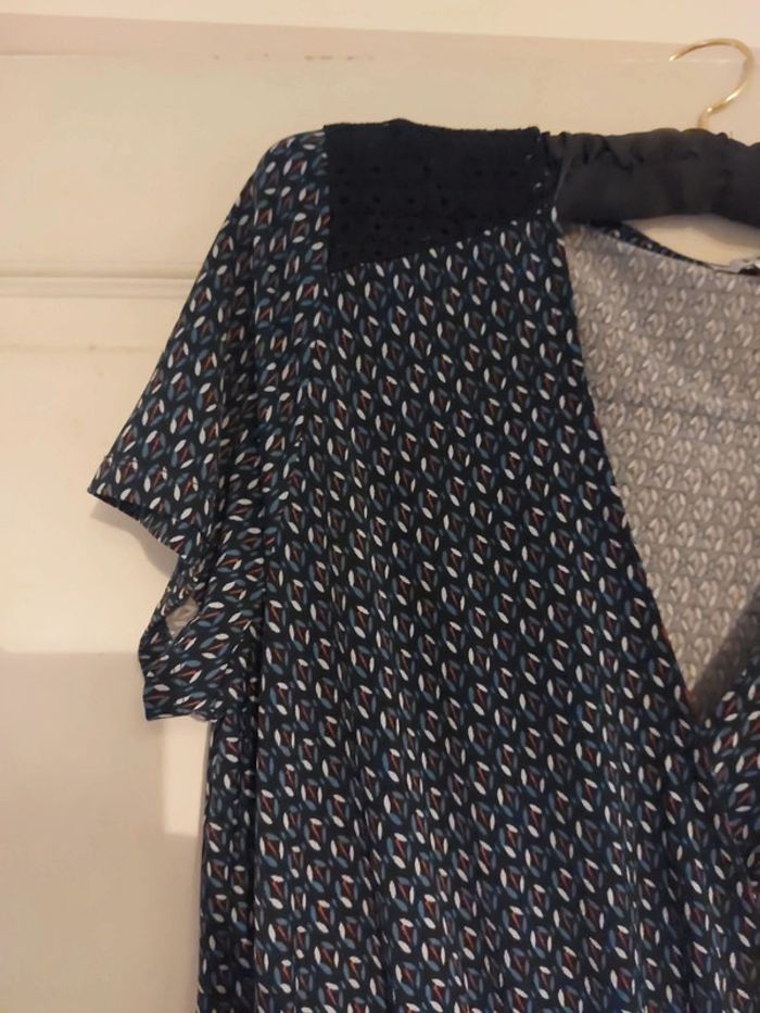 Robe demi saison idéale à l'automne Non Doublée A motifs géométriques J'ai été trop optimiste en l'achetant ! Je mets du 48... donc neuve jamais portée Épaules ajourées Ceinture et Resserrée à la taille Décolleté cache cœur avec bouton