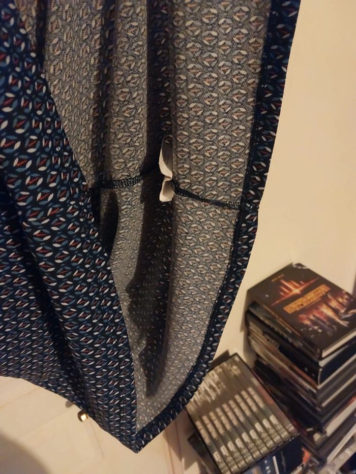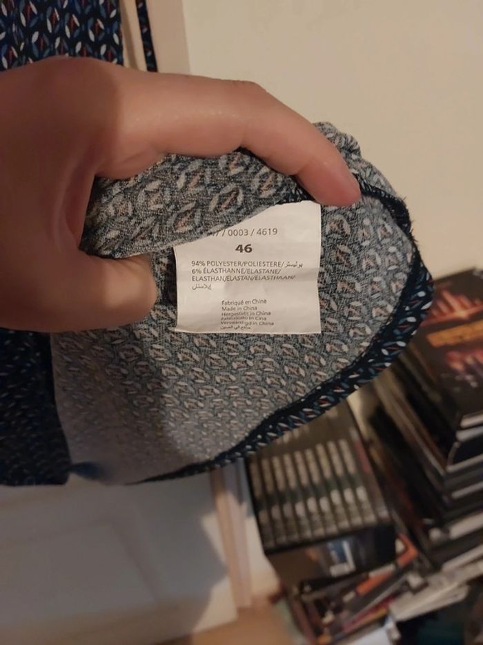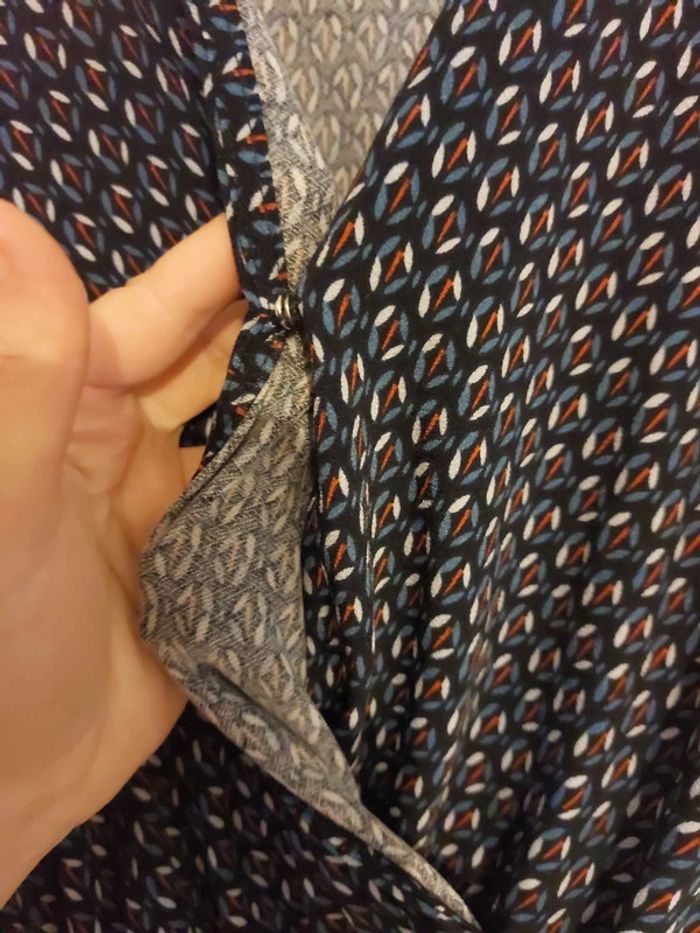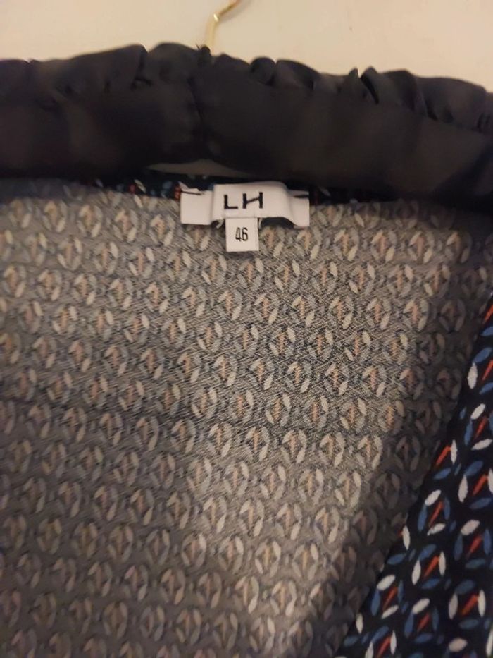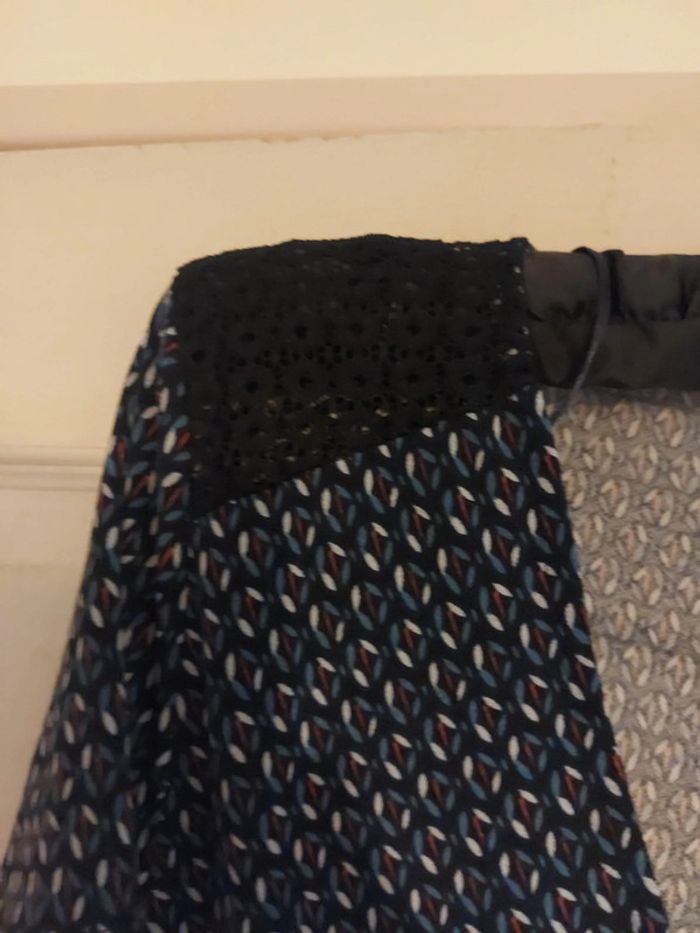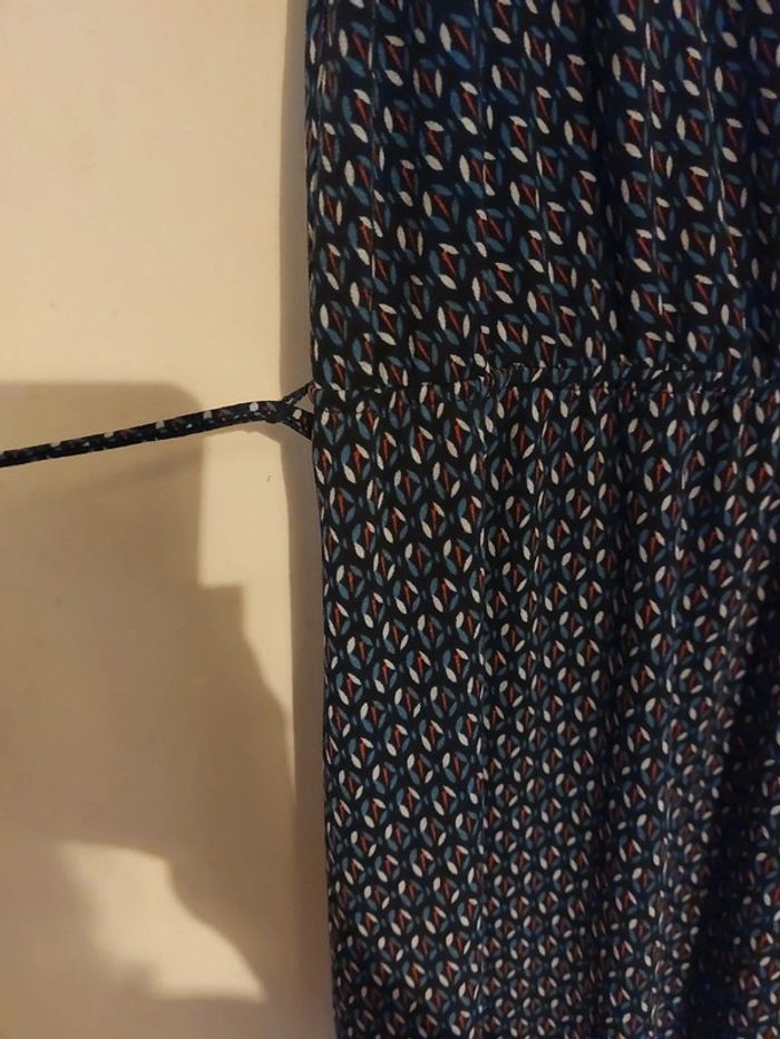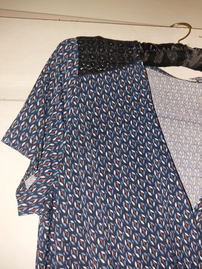 Robe demi saison idéale à l'automne Non Doublée A motifs géométriques J'ai été trop optimiste en l'achetant ! Je mets du 48... donc neuve jamais portée Épaules ajourées Ceinture et Resserrée à la taille Décolleté cache cœur avec bouton