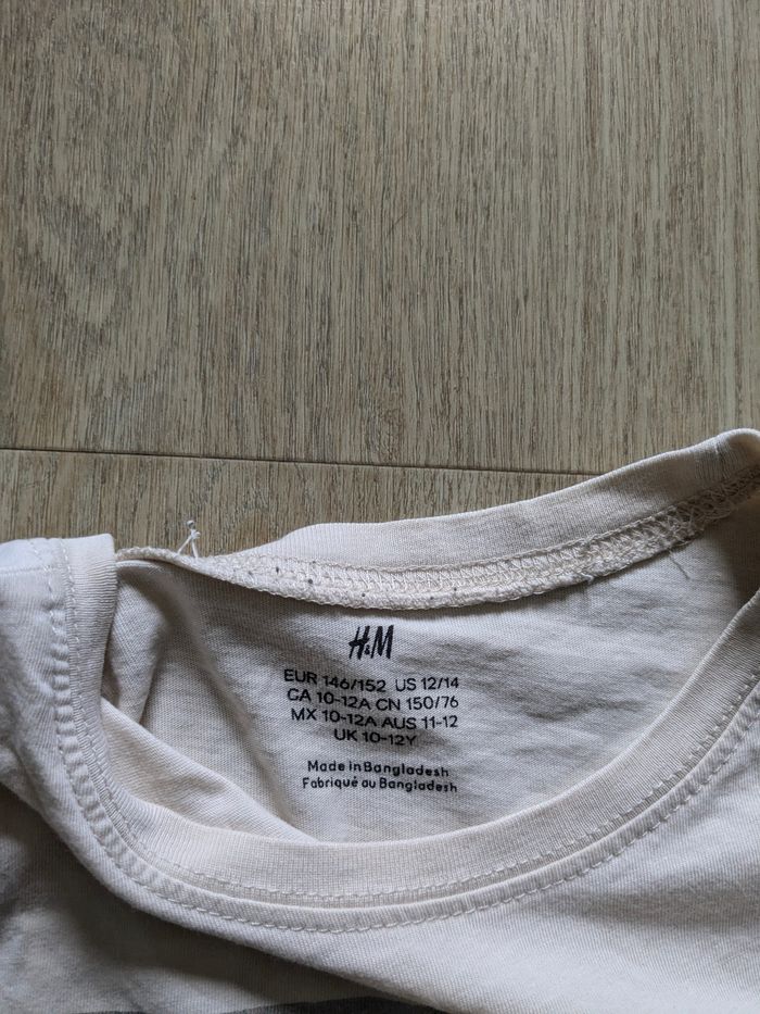T-shirt H&M porté quelques fois un défaut la couture du bas c'est un tout petit enlever mais sa ne vois pas du tout taille entre 10 et 12 ans
