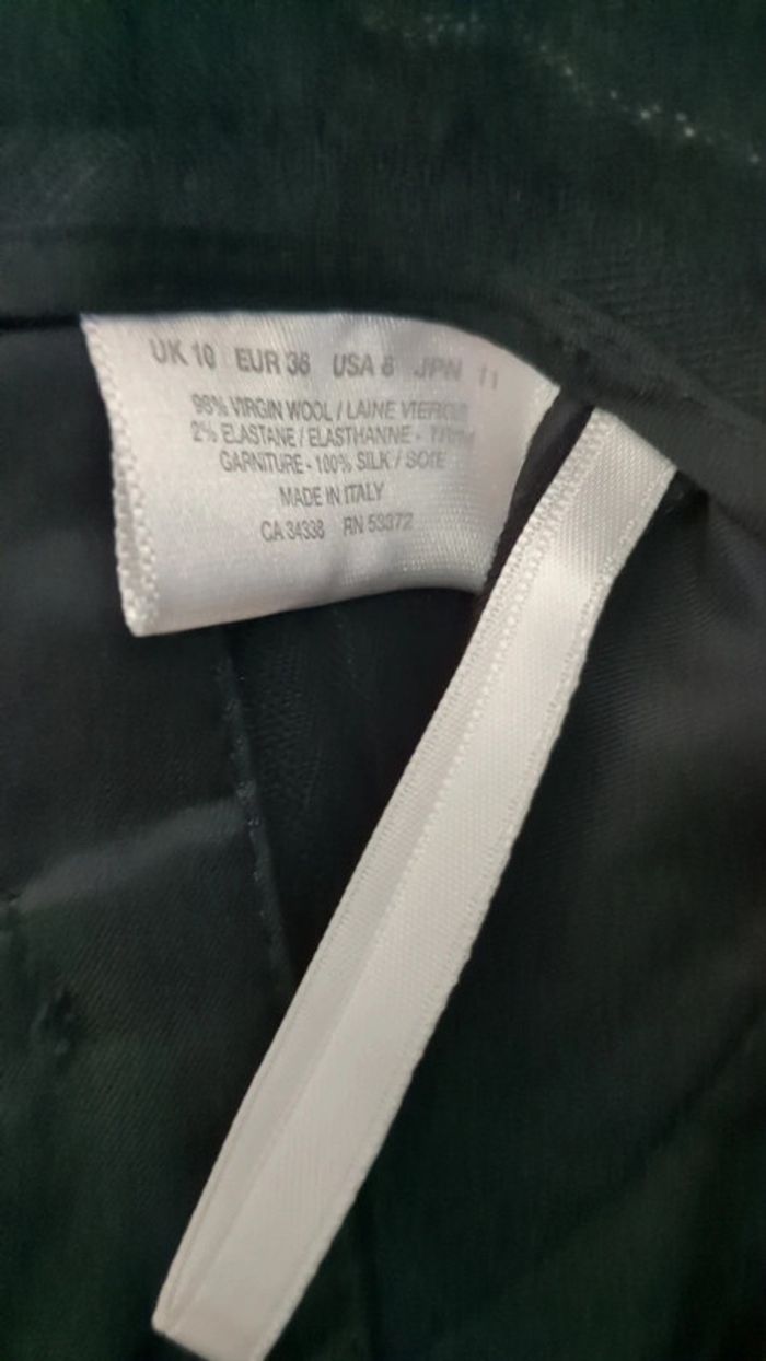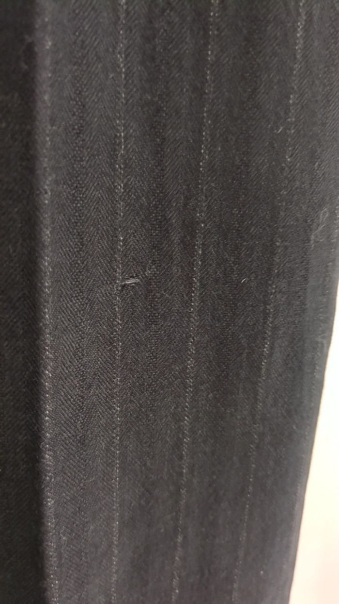 Un petit trou est en formation au niveau de la jambe gauche (voir dernière photo). Autrement, le pantalon est en parfait état. Longueur à l'entrejambe 84 cm. Largeur au bas de la jambe 28 cm. 98% laine vierge 2% elasthanne Garniture 100% soie #celedrian36