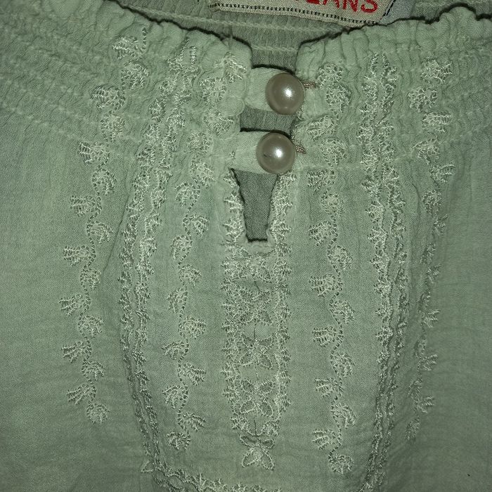 Jolie robe tunique bohème Vert tendre / vert d'eau Boutons nacrés Détails broderie Col bardot Neuve Taille 4 ans #Sojujadfille #sojujadfille4ans #sojujadfillerobe #sojujadfillerobe4ans #dressingfille #printempsete #colbardot #taille4ans #bohème
