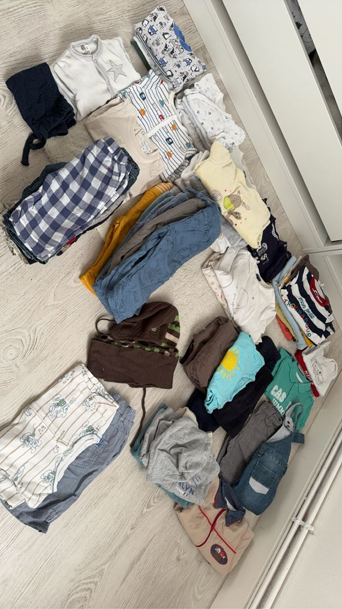 6 mois : 5 pyjamas, 1 t shirt manches longues, 6 pantalons, 1 manteau hiver