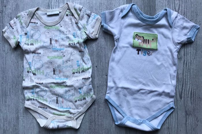 lot de 2 bodys à manches courtes de la marque King Bear taille 9/12 mois présence d’un petit accroc recousu sur le blanc (voir photo) occasion, bon état