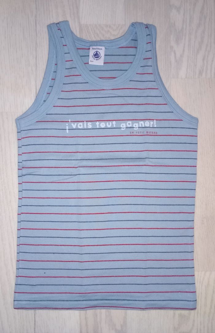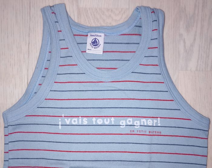 Débardeur bleu ciel à fines rayures motif "je vais tout gagner en petit bateau" Marque : Petit Bateau T. 8 ans Très bon état général