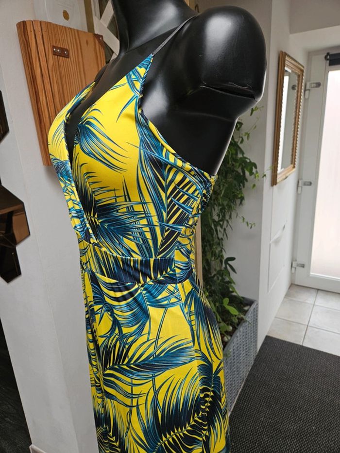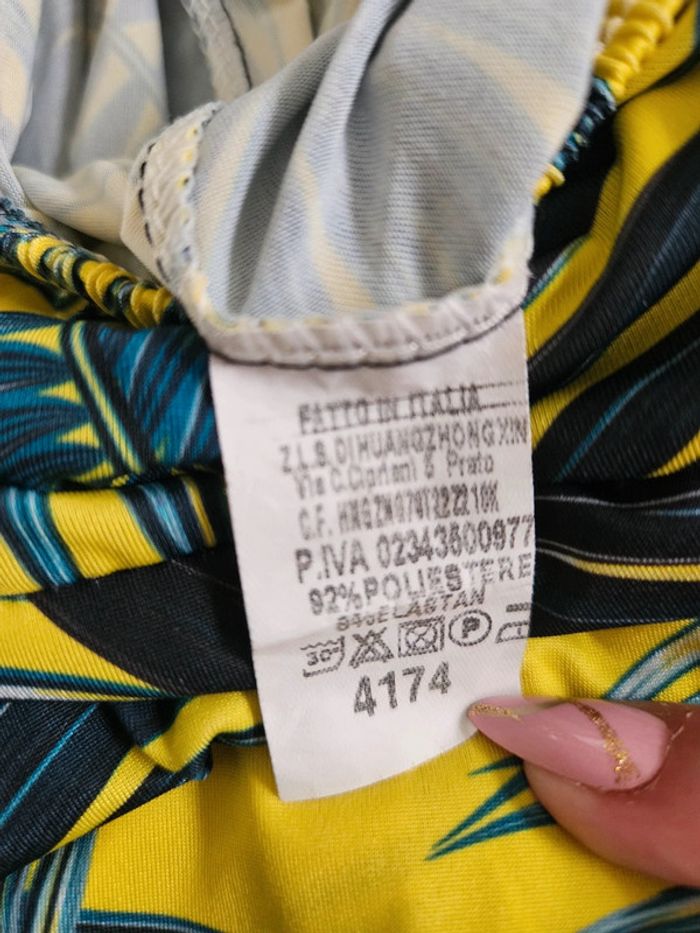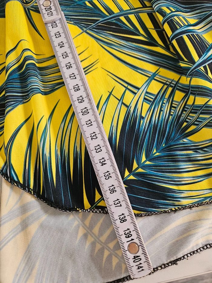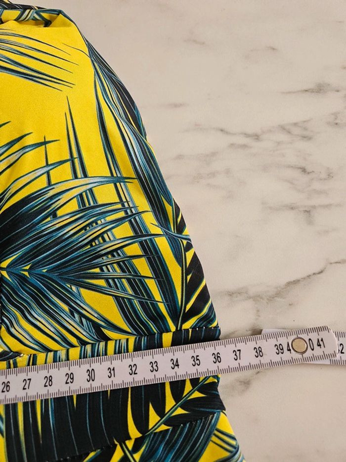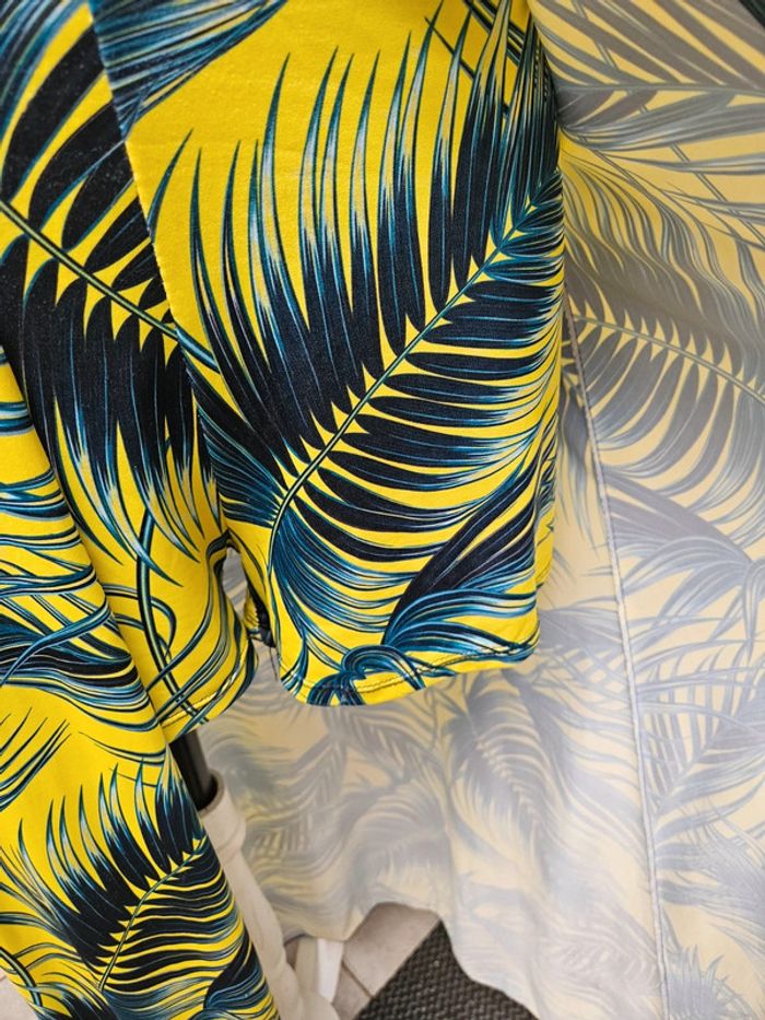 Portée mais reste en très bon état. Jaune flash à motifs noir, vert. Matière fluide et extensible. Parfaite pour une taille L Remboursée au niveau de la poitrine