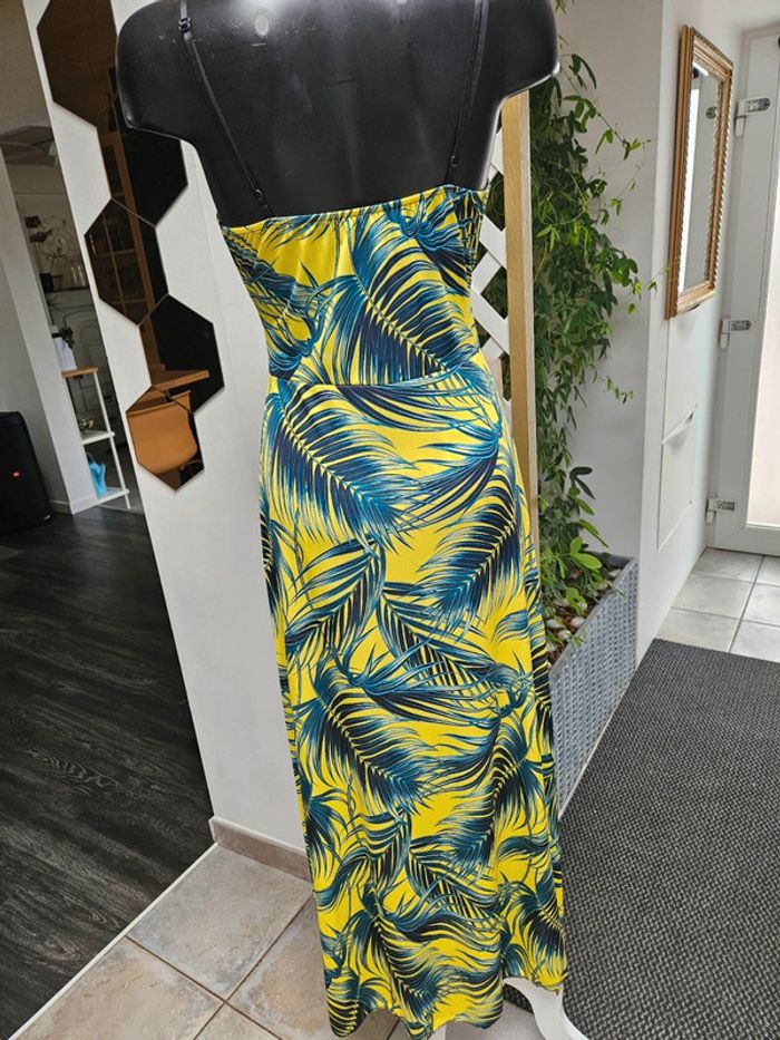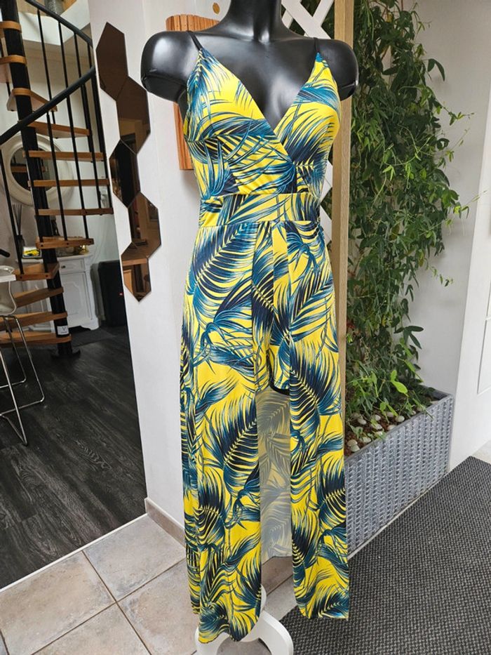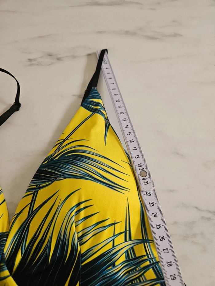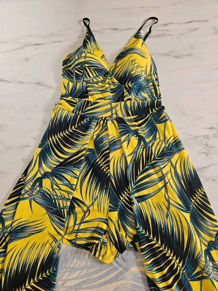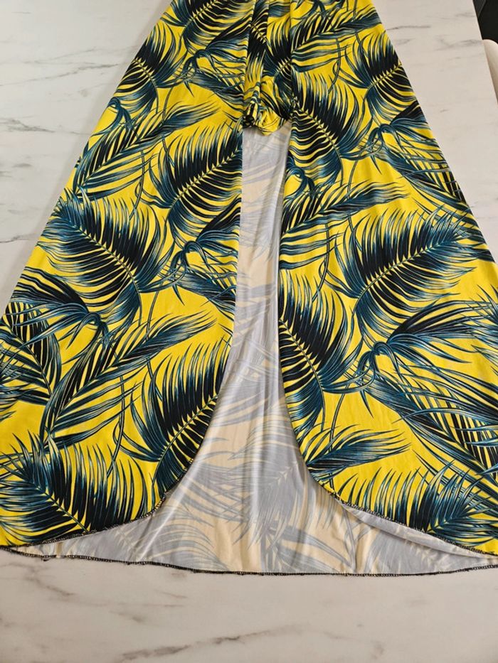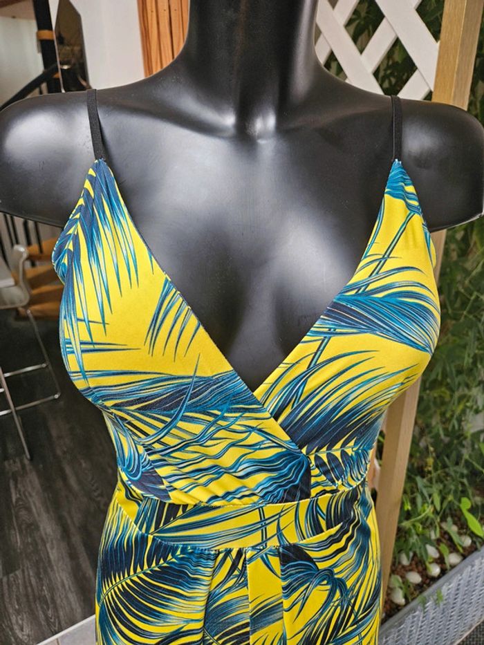 Portée mais reste en très bon état. Jaune flash à motifs noir, vert. Matière fluide et extensible. Parfaite pour une taille L Remboursée au niveau de la poitrine