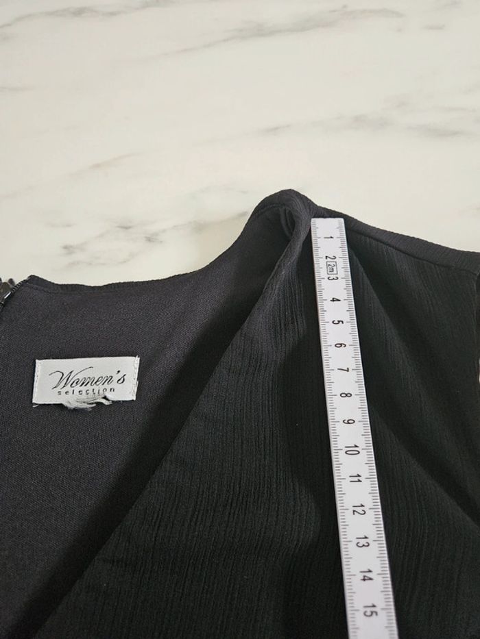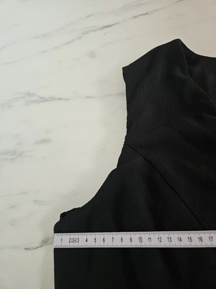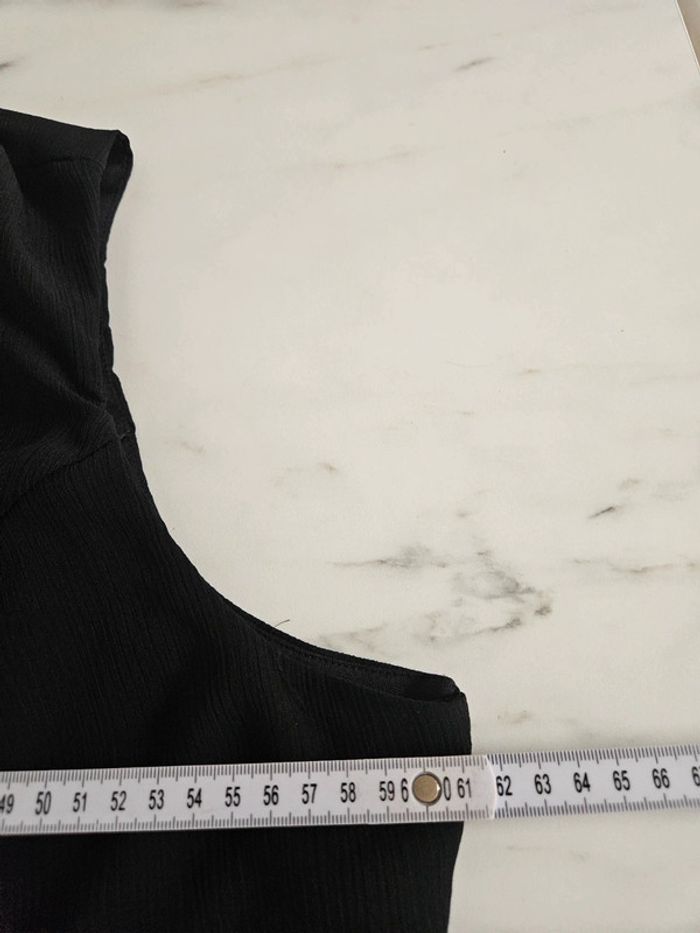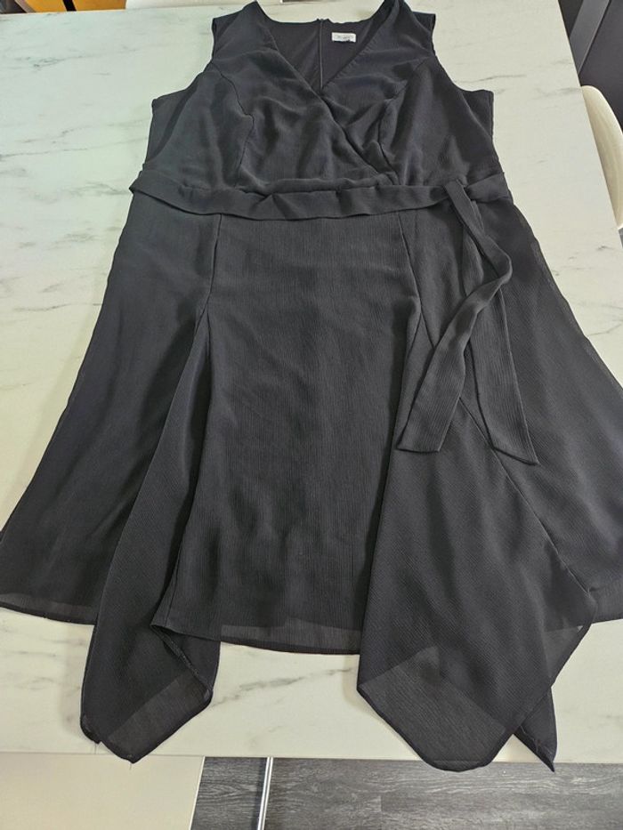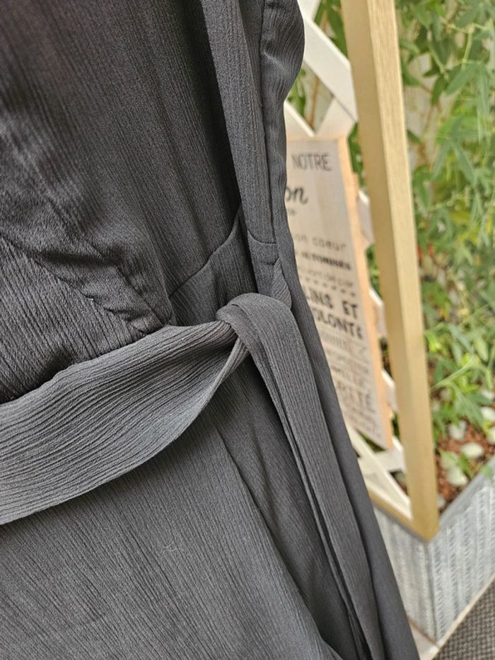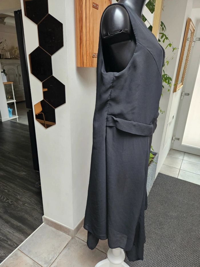 Robe noir en matière crépon avec le bas asymétrique à nouer à la taille. Elle doit correspondre à une taille 52 Il n'y a plus d'étiquette mais les dimensions se trouvent sur les photos. Portée mais elle reste en très bon état