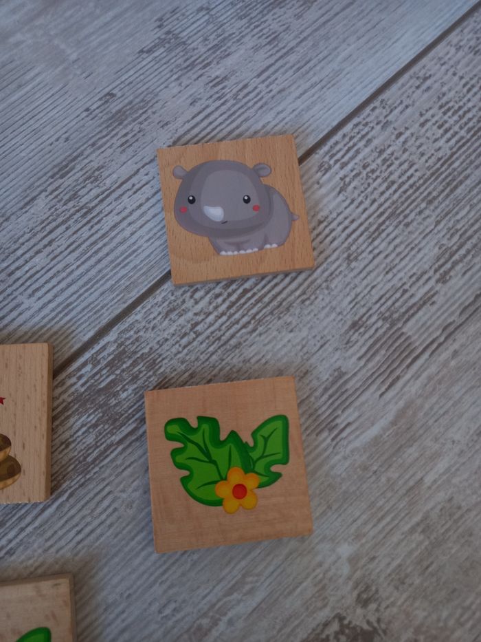 Memory en bois en excellent état. Seul le rhinocéros est en un seul exemplaire et la fleur en 3, erreur lors la fabrication nous l'avons donc eu comme ça,il suffit de retirer ses pièces.