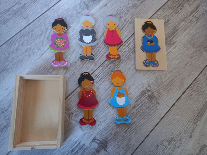 Jeu d'assemblage de petites filles en bois. Il faut coordonner la tête le corps et les jambes des petits personnages. En excellent état