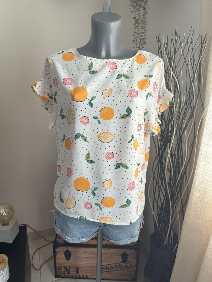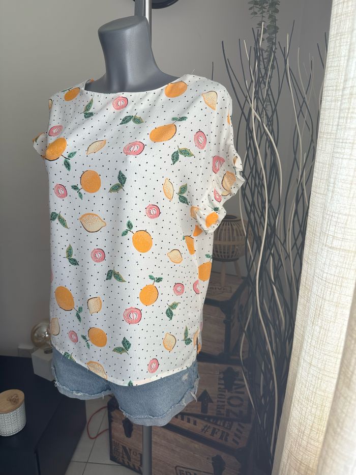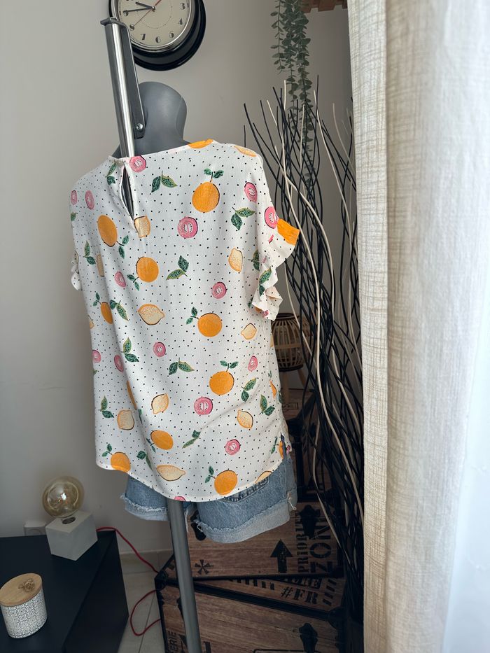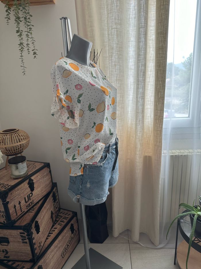 Blouse blanche , matière fluide , manches courtes avec volant au bas de manches , bouton au cou , coupe droite Taille XS. Kiabi. Neuve avec étiquette