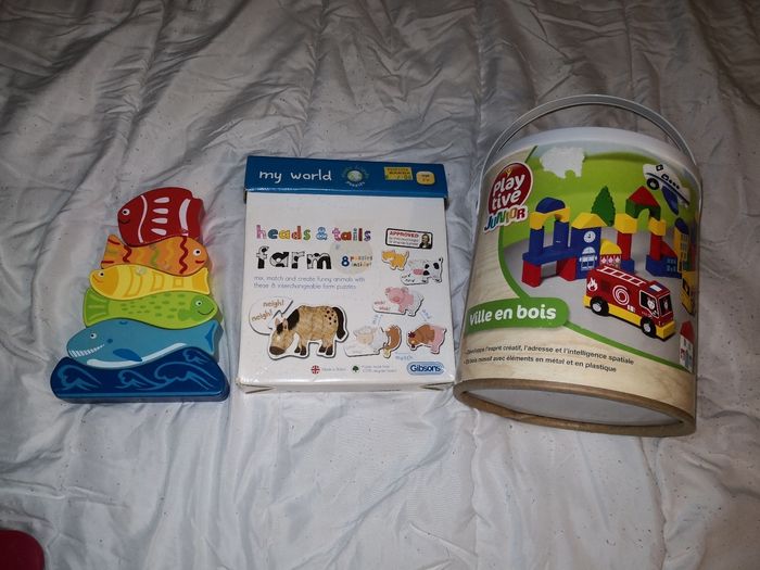 Lot jouets 2 en bois encastrement et construction et un puzzle animaux de la ferme
