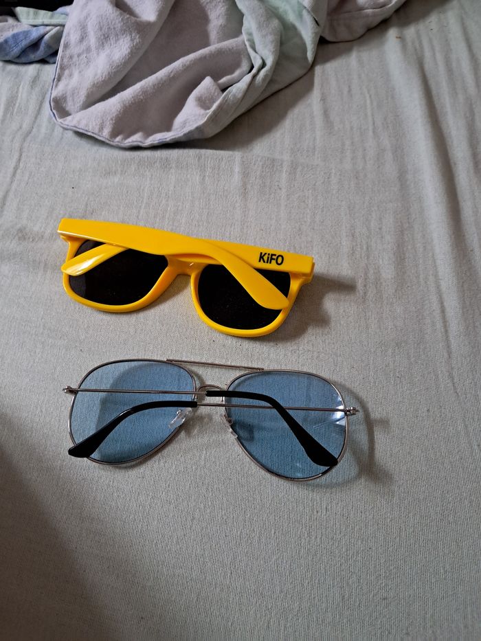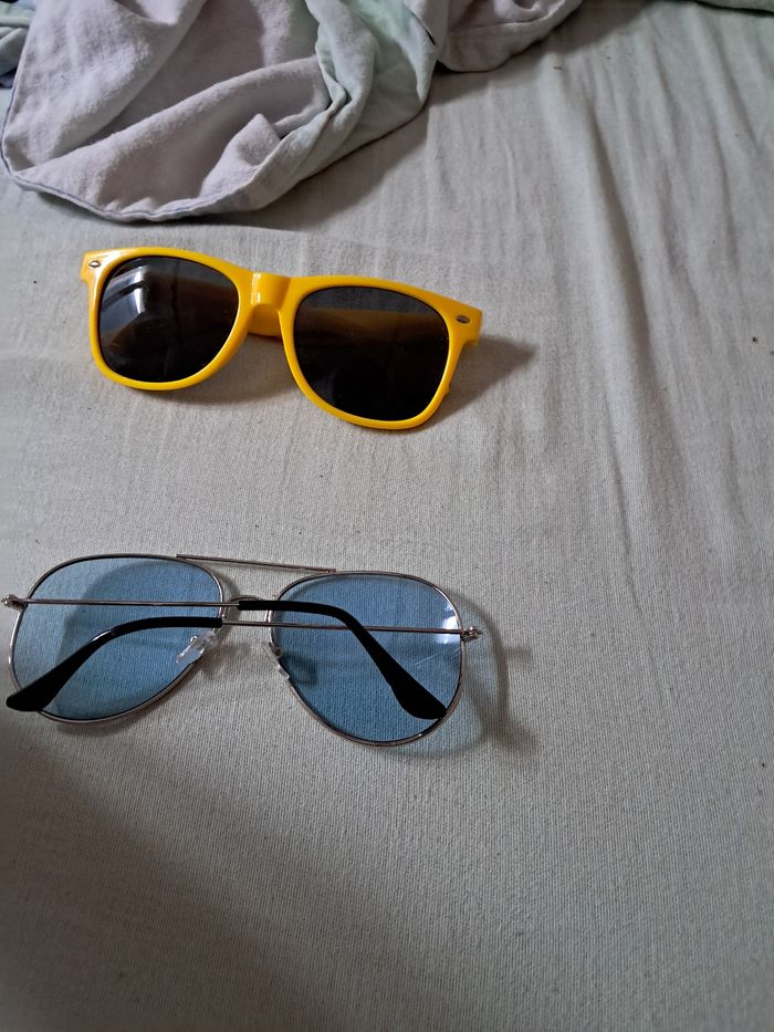 Lots 2 lunettes de soleil mixte. Les lunettes bleu style aviateur en métal et jaune en plastique jamais porté