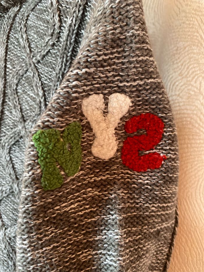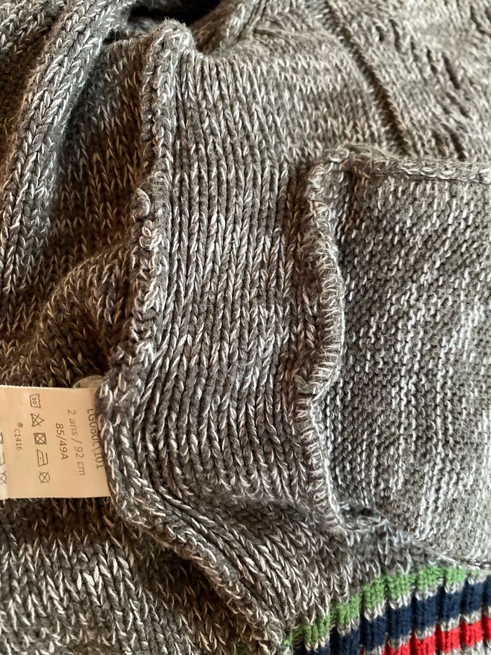 Gilet à capuche gris chiné torsadé en état proche du neuf Bordures rayures bleu marine vert et rouge 2 poches Fourrure synthétique bleu marine en doublure de la capuche Taille 2 ans 86 cm 67% coton 33% polyester Orchestra