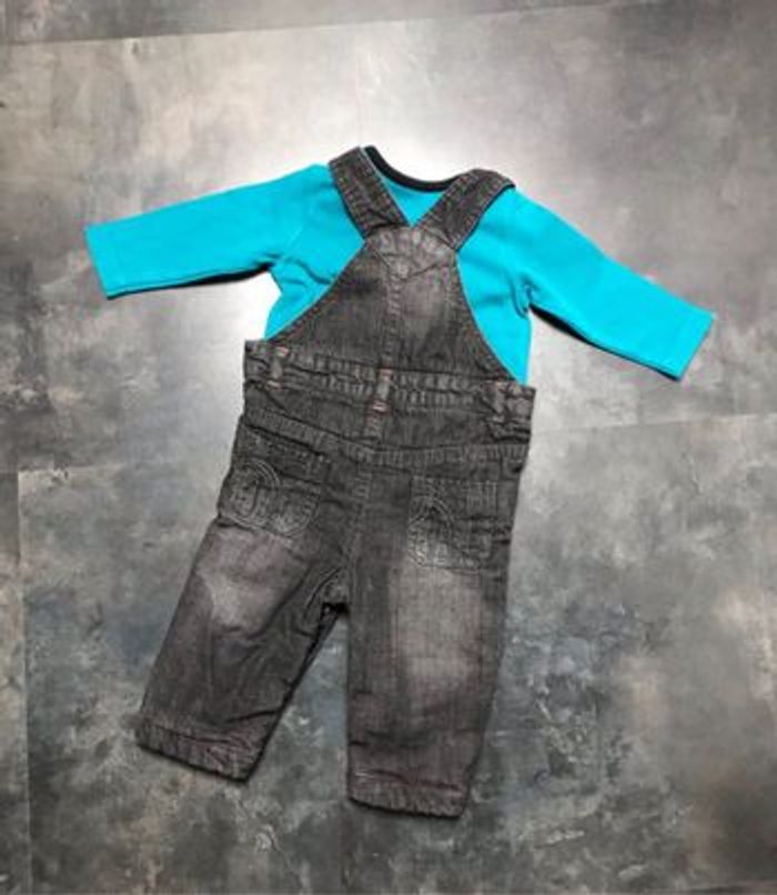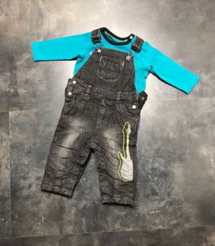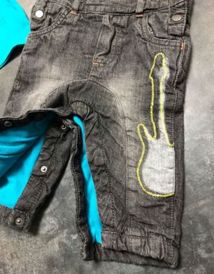 Ensemble salopette en jeans noir doublée polaire bleu canard, brodée guitare électrique et t-shirt épais manches longues même bleu sérigraphié guitare également taille 6 mois 67 cm Orchestra Parfait état