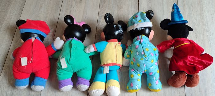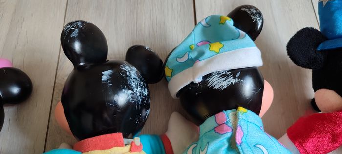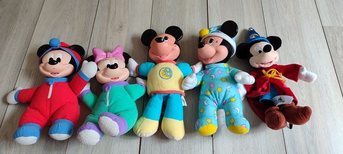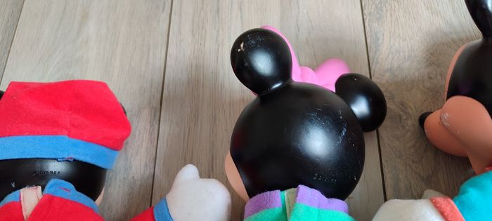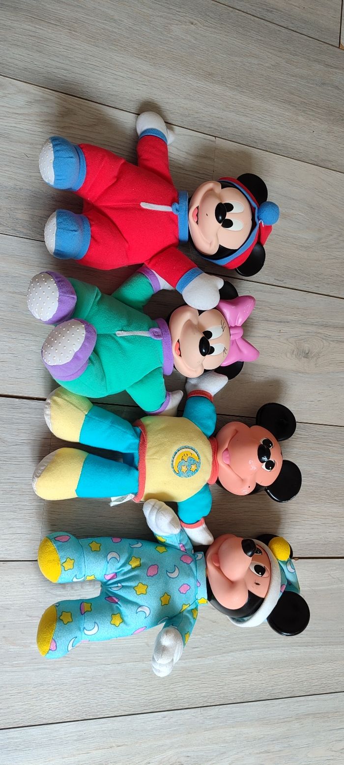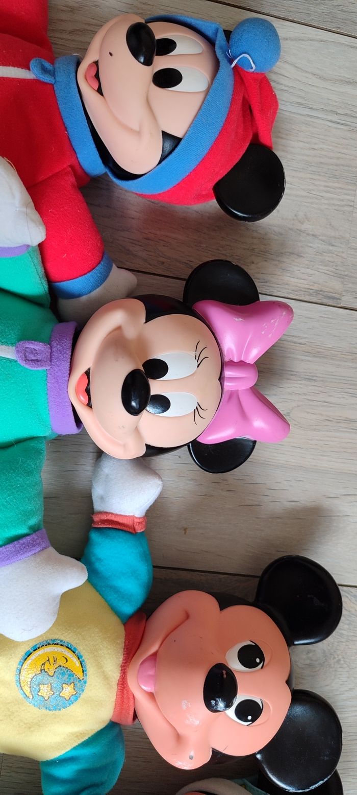 Peluche mickey et Minnie vintage des années 90. Les peluches sont comme sur les photos. Il y a 2 peluches qui font de la lumière. BIen voir les photos avant tout achat, aucun retour possible. 6€ pièce