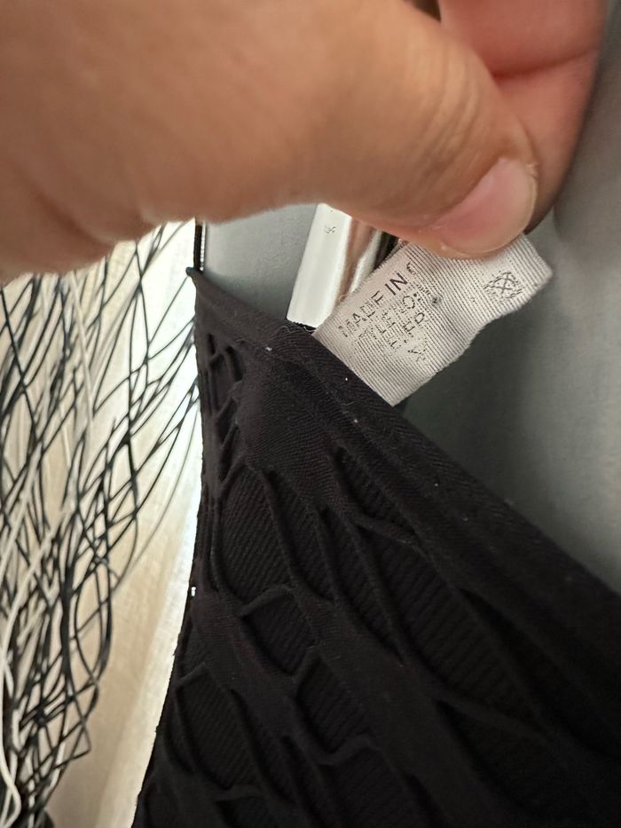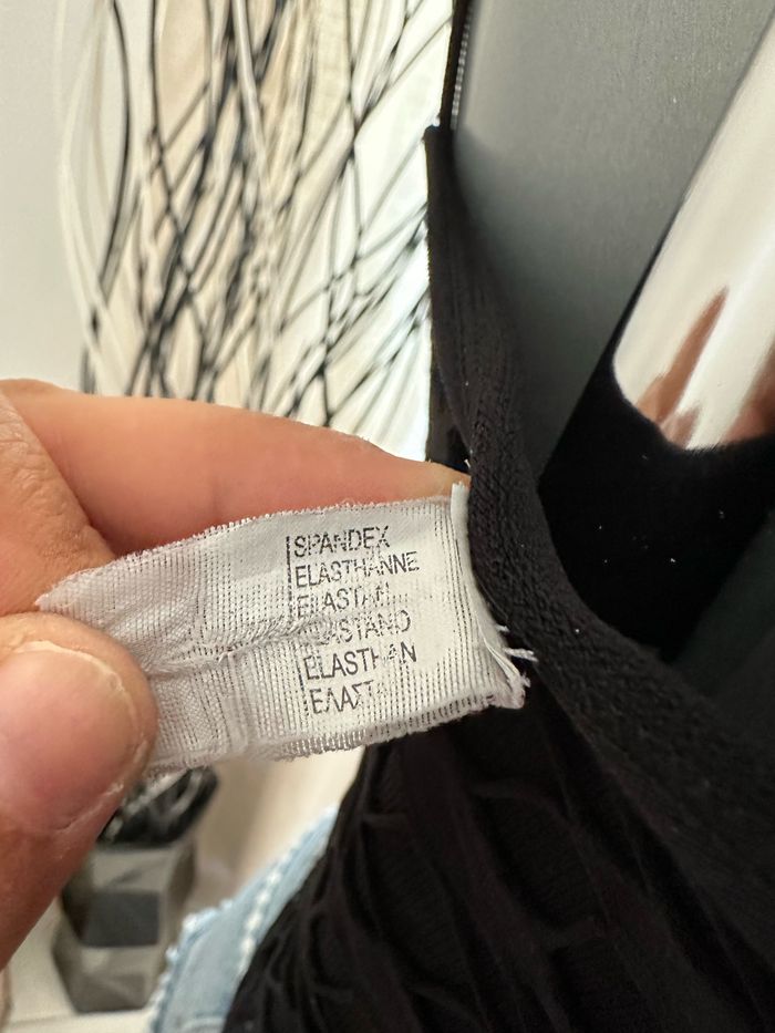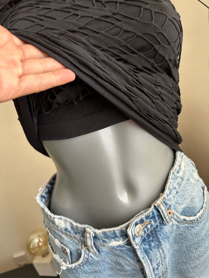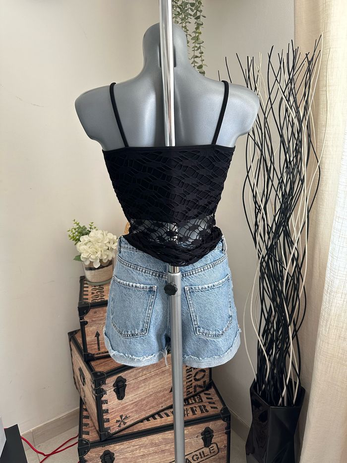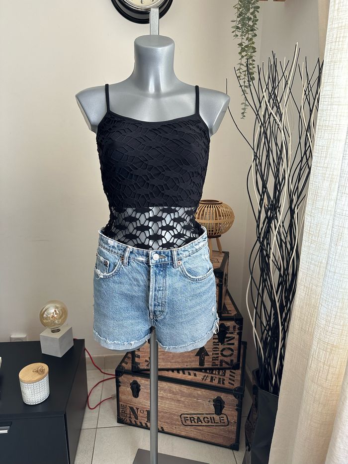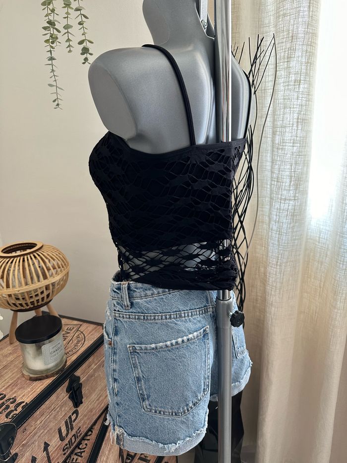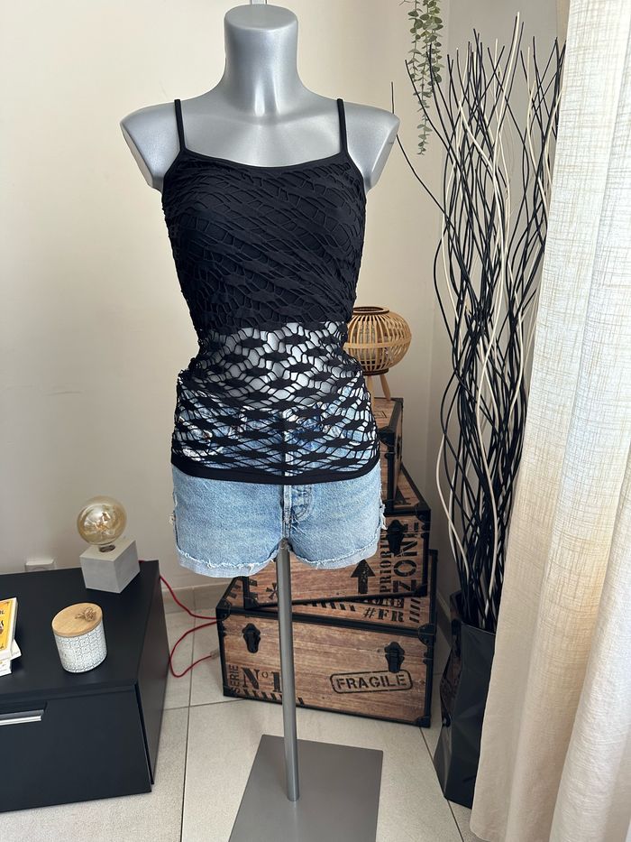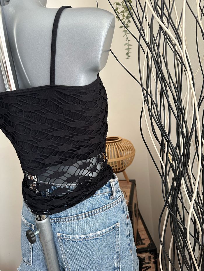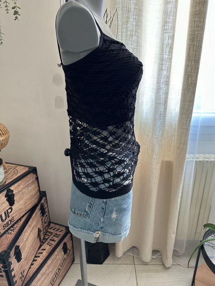 Débardeur noir ajouré , matière comme les collants et extensible , bandeau intégré au niveau de la poitrine Taille S. Sans marque. Seconde main en très bon état