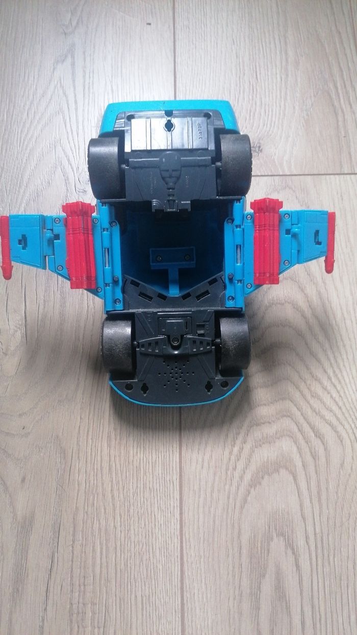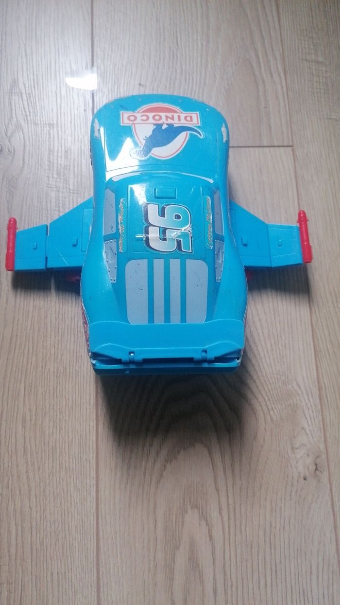 Ceci est une voiture qui roule. Les dimension sont de environ 25 cm de largeur et 12 cm d'épaisseur sans les ailes. Ce jouet possède des ailes depliables sur le côté.