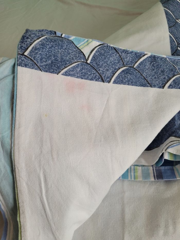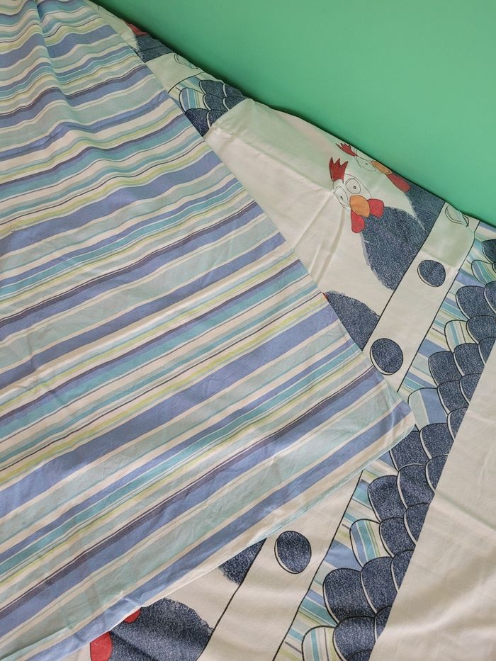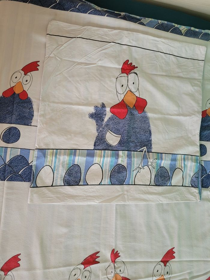 Housse de couette et taie lit 190x90 cm Housse de couette avec taie de 63x63 cm Adapté pour lit standard de 90x190 cm En bon état Quelques tâches visibles dans un coin de la housse de couette, cf photo