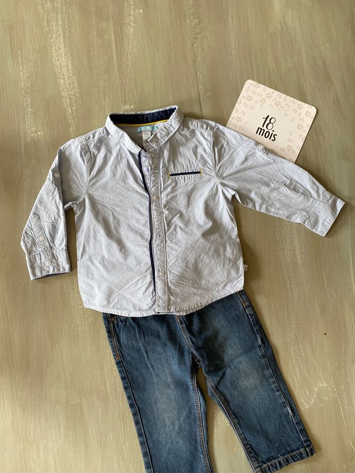 Ensemble jean et chemise à manches longues pour garçon, 18 mois ✨ Chemise et jean ✨ 🛍️ Plusieurs marques (Kiabi et Obaïbi) 📏 Taille : 18 mois 🫧 Très bon état, peu portés ☁️ Matière : 100% coton